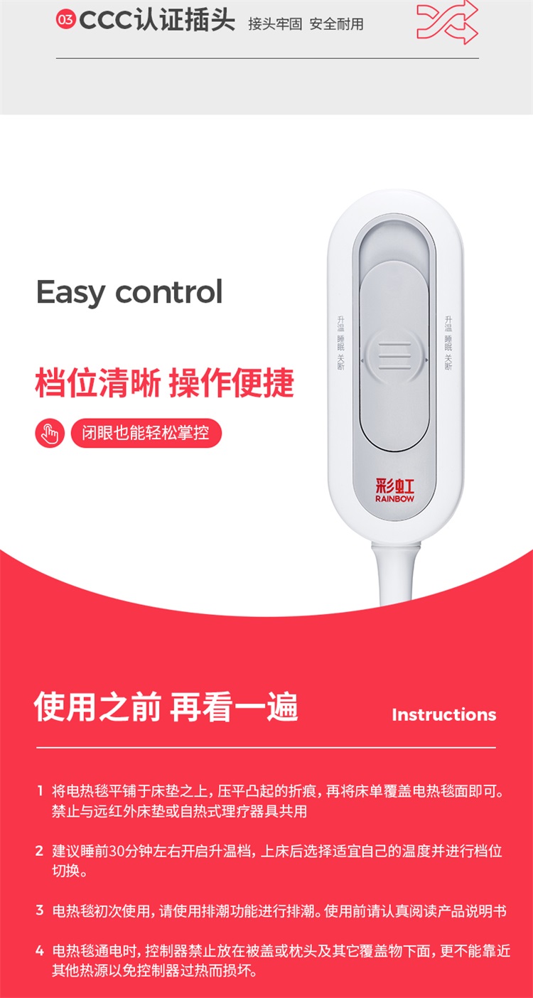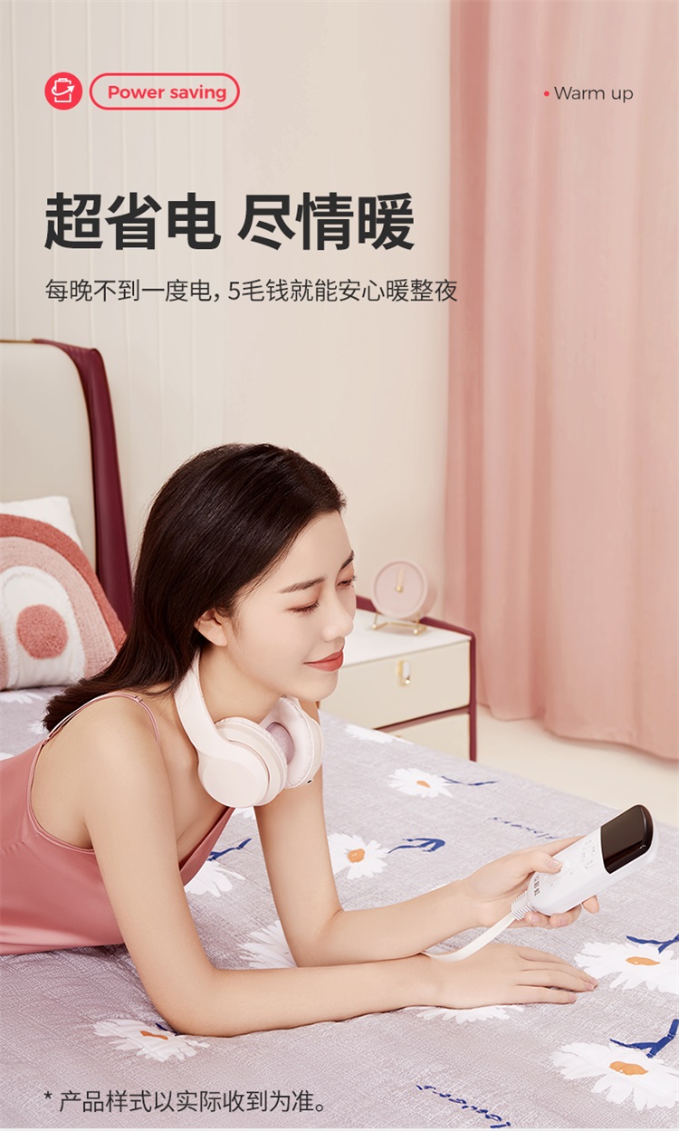 彩虹全线路安全保护调温电热毯(双人)纯色1.5米*1.2米XL1202 型号TT150X120-4XA 90W