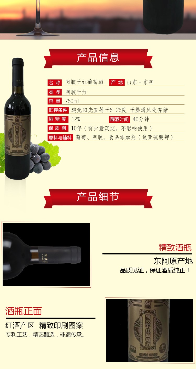 6瓶 阿胶干红葡萄酒红酒12度精选750ml*6瓶
