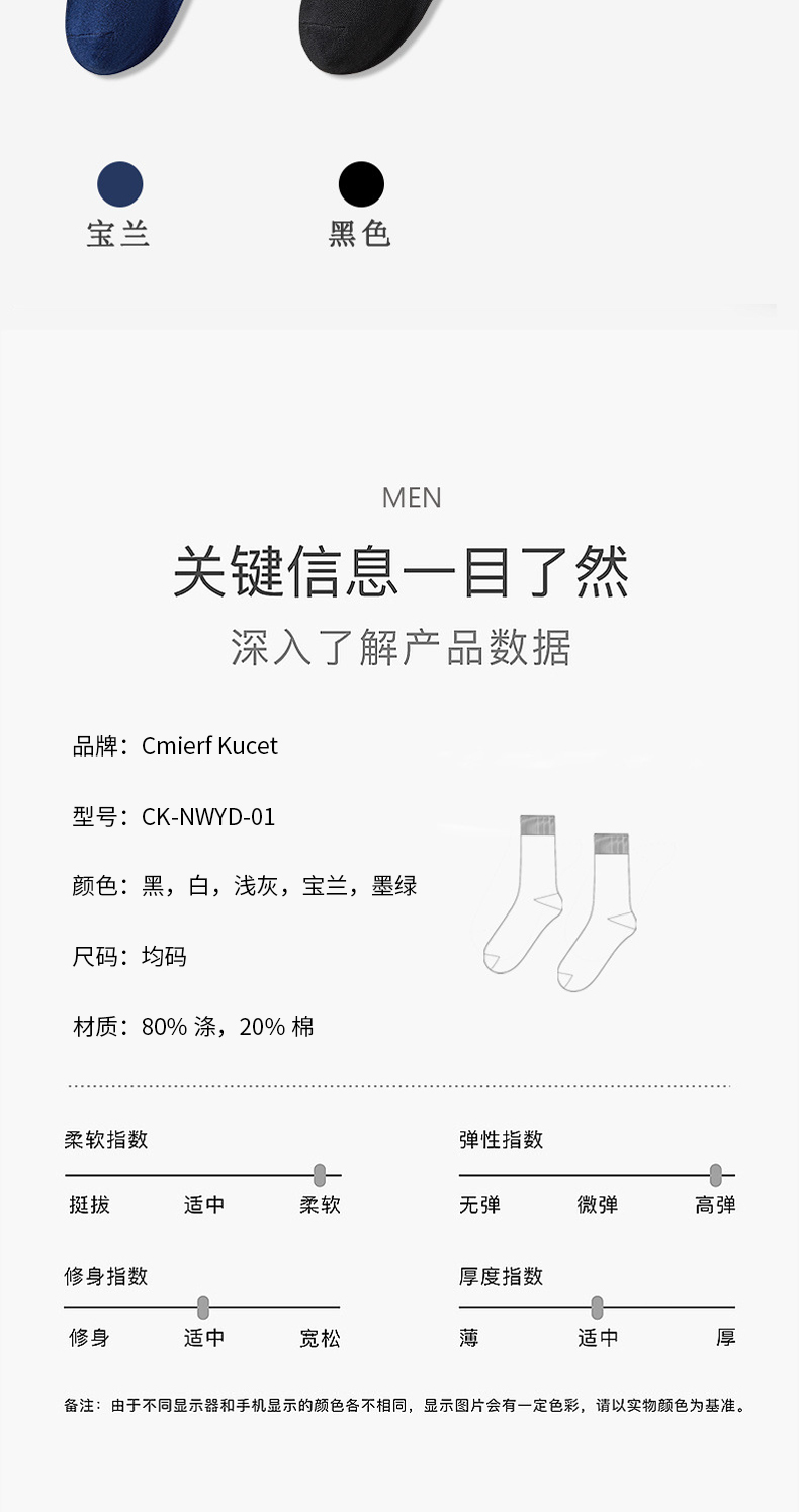Cmierf Kuect(中国CK)男女黑白浅灰宝蓝绿色运动袜(五双装)CK-NWYD-01