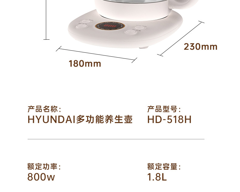HYUNDAI多功能养生壶HD-518H【新疆/西藏/港澳台不发货】