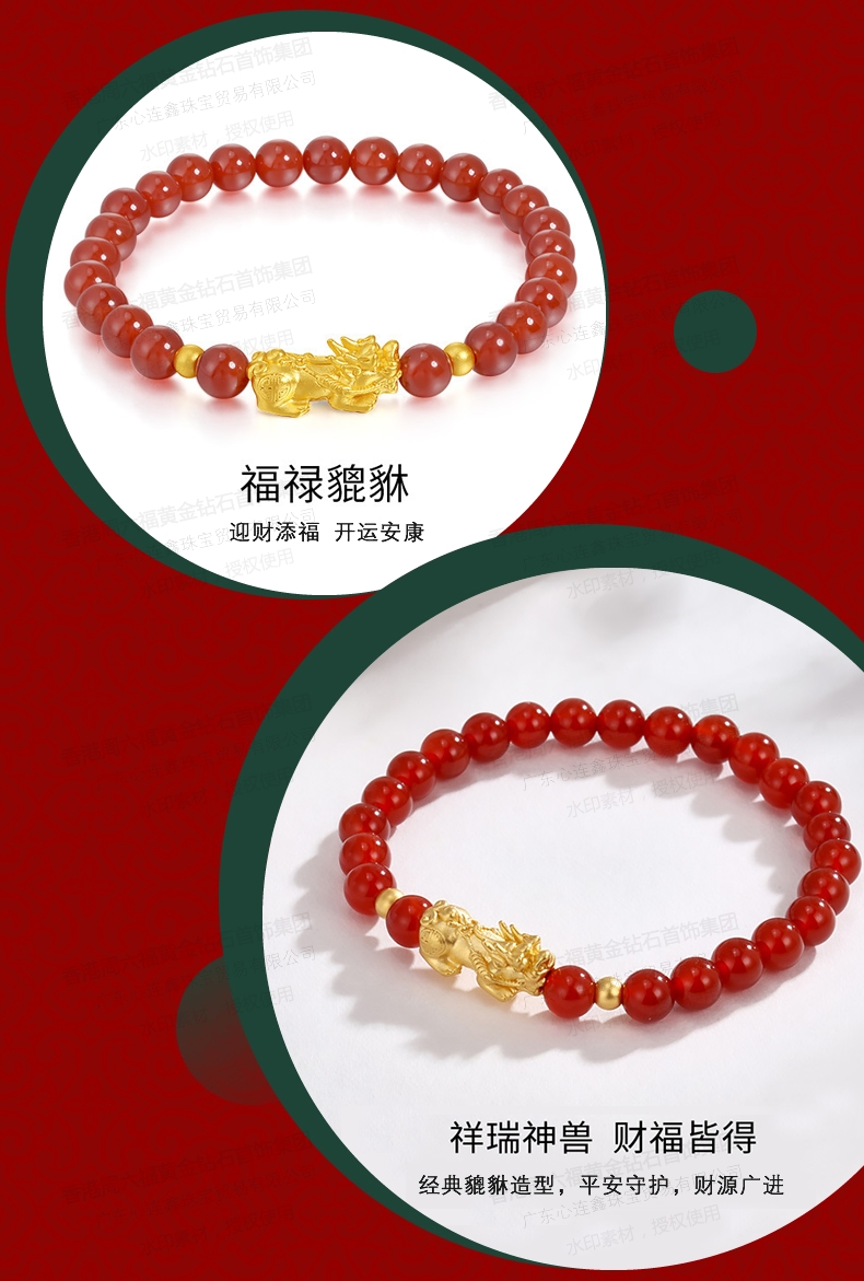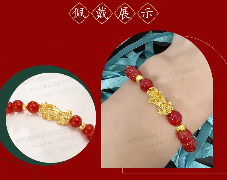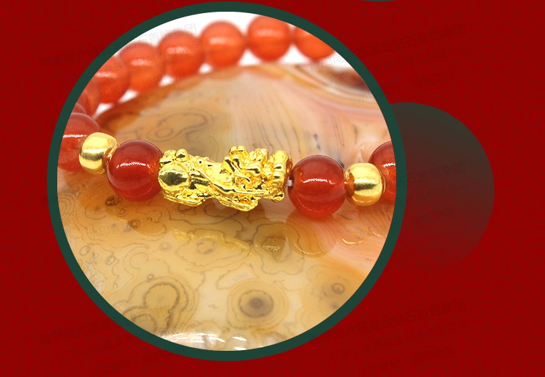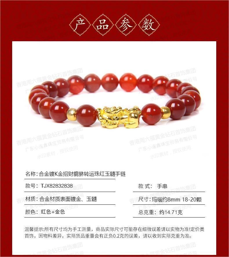 香港周六福SHIGEFUKU黄金钻石首饰合金镀K金招财貔貅转运珠红玉髓手链【每证一品】