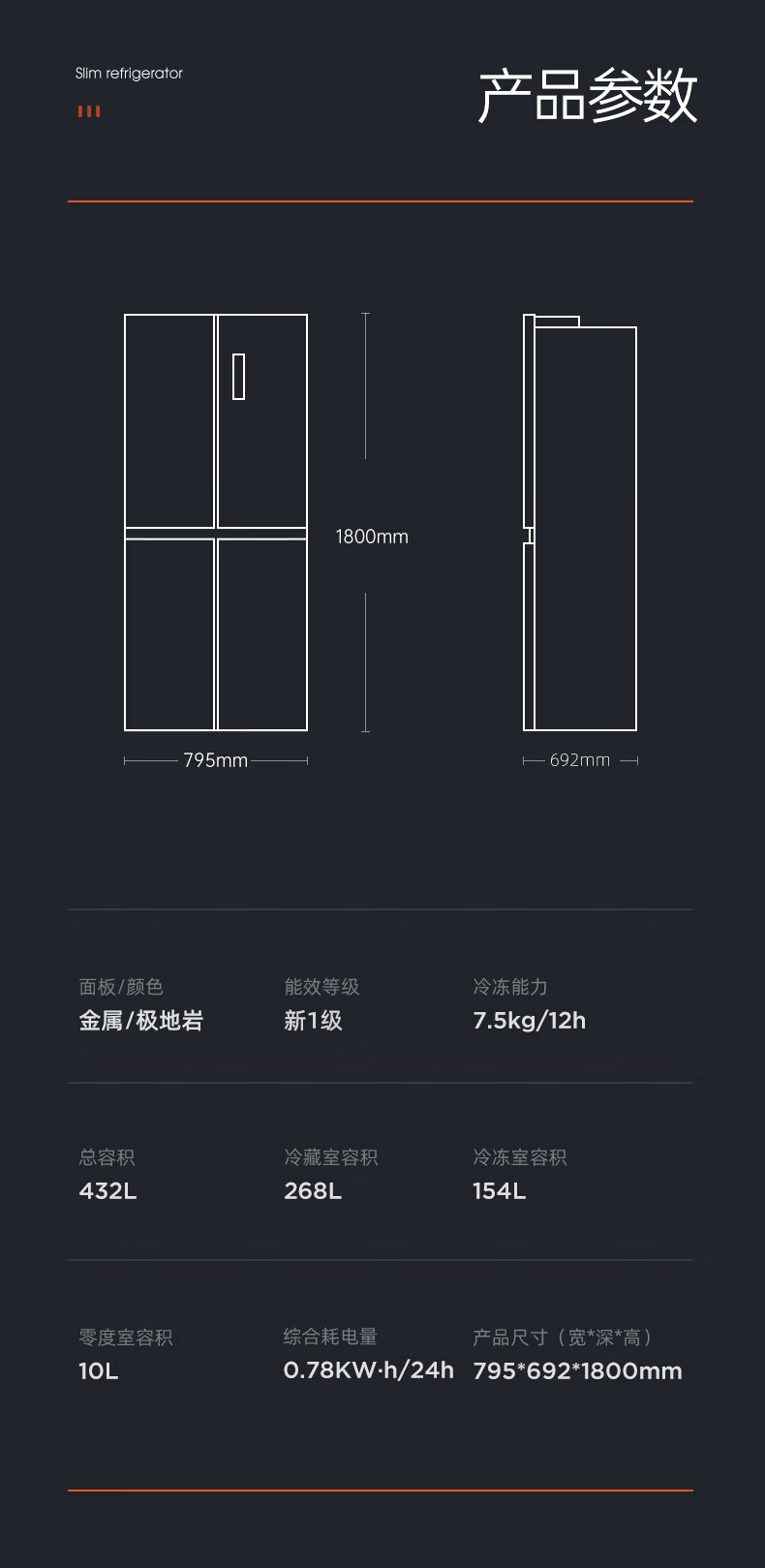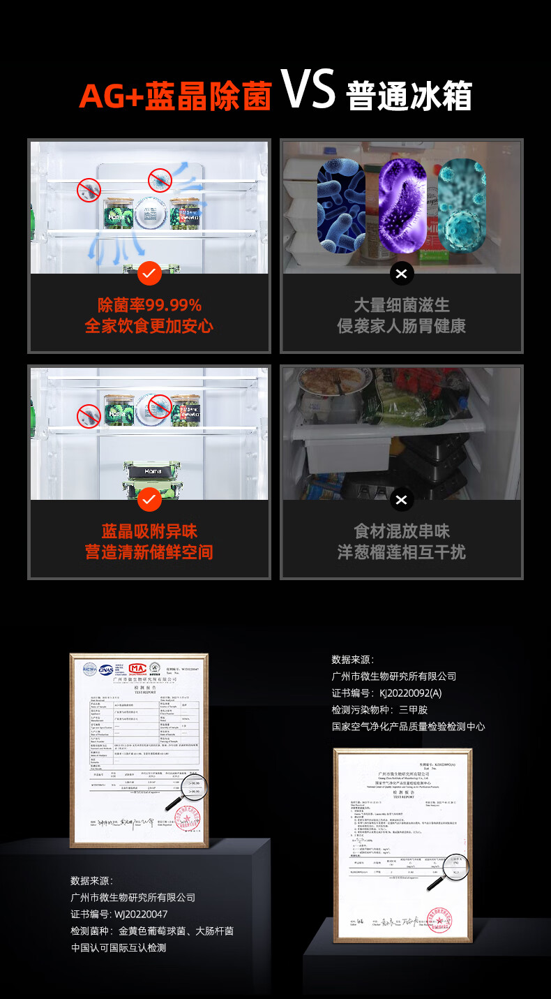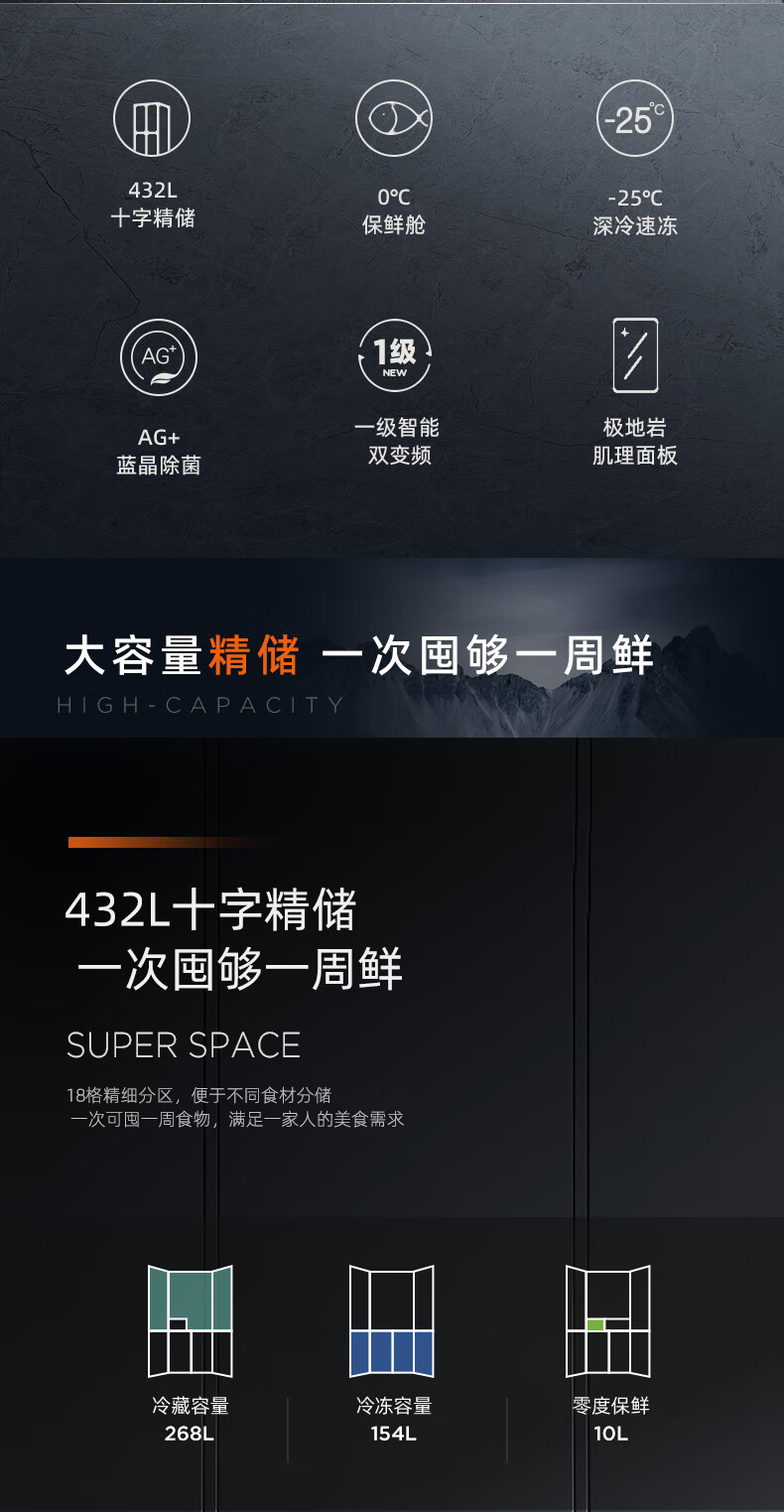 出口冠军品牌J-奥马/Homa 原装出口机型 家用432升十字门电冰箱 零度保鲜智能双变频 一级能效 AG+蓝晶除菌 型号:BCD-432WDPM/B极地岩 送货上楼