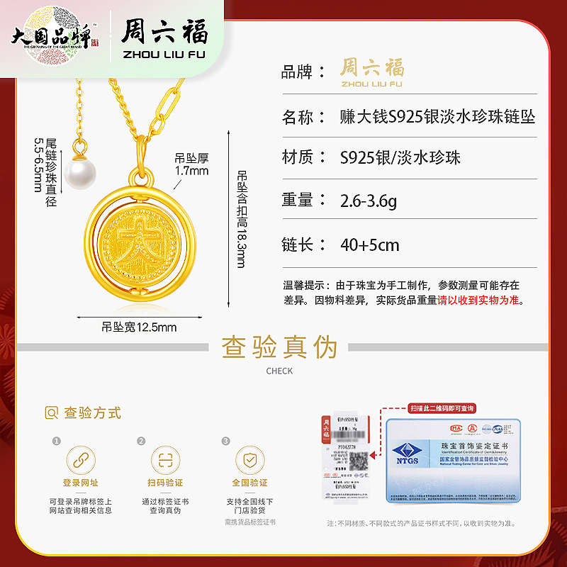 【每证一品】周六福赚大钱S925银淡水珍珠链坠ZLFX061963