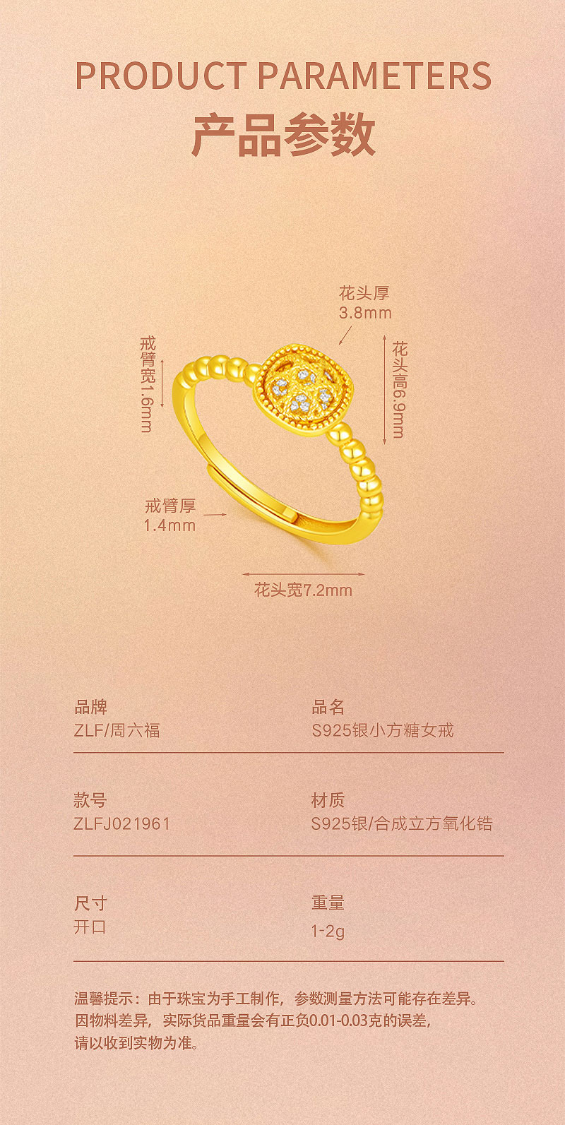 周六福S925合成立方氧化锆小方糖女戒ZLFJ021961