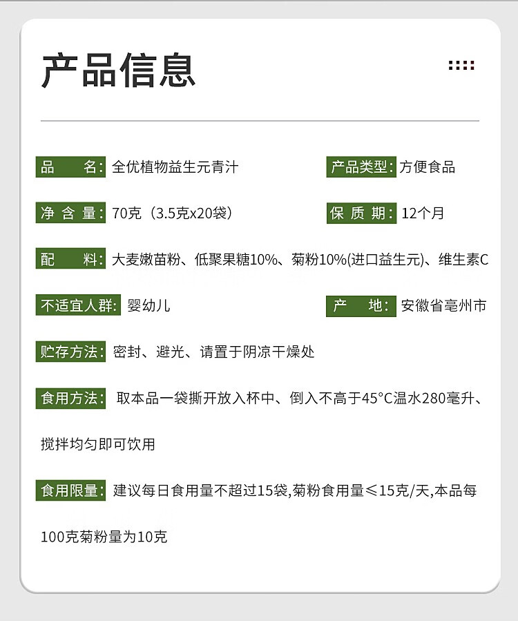 【福东海】全优植物益生元青汁70克(3.5克*20袋)/盒