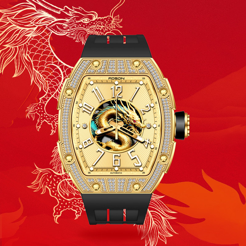 劳士顿(ROSDN)龙年特别款国潮酒桶形机械男表2745 金色