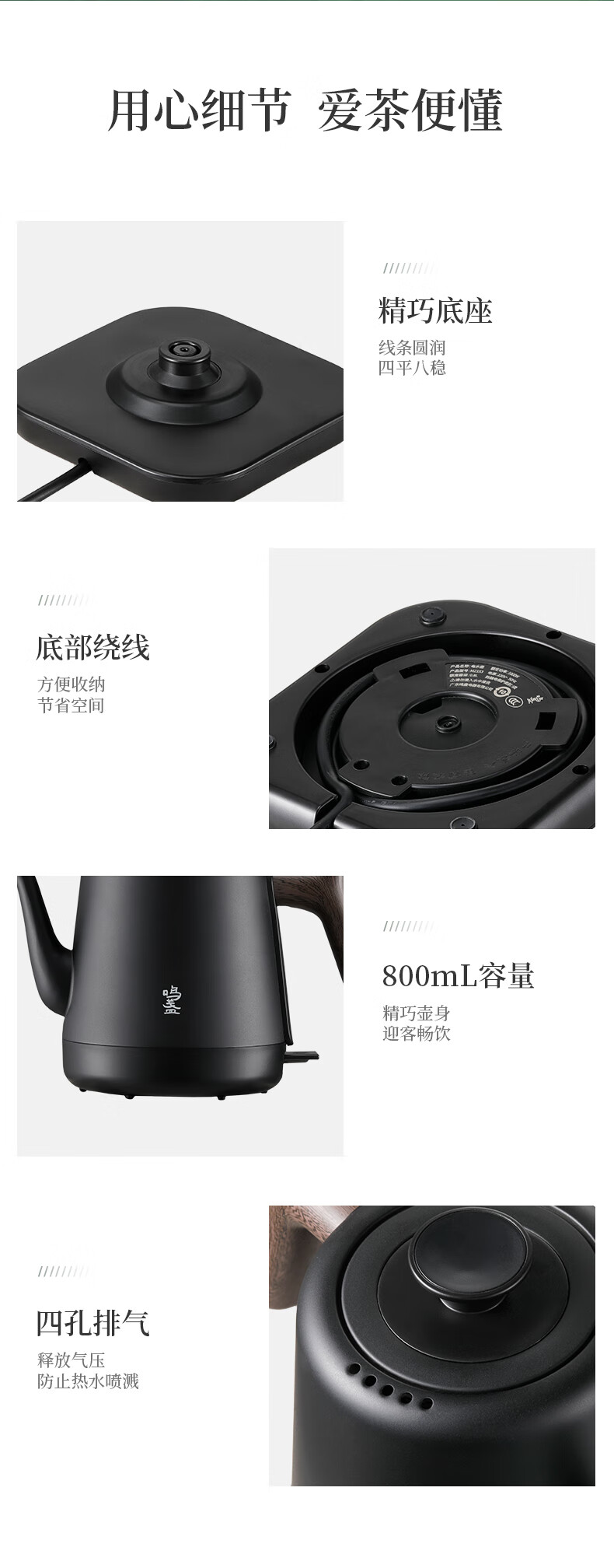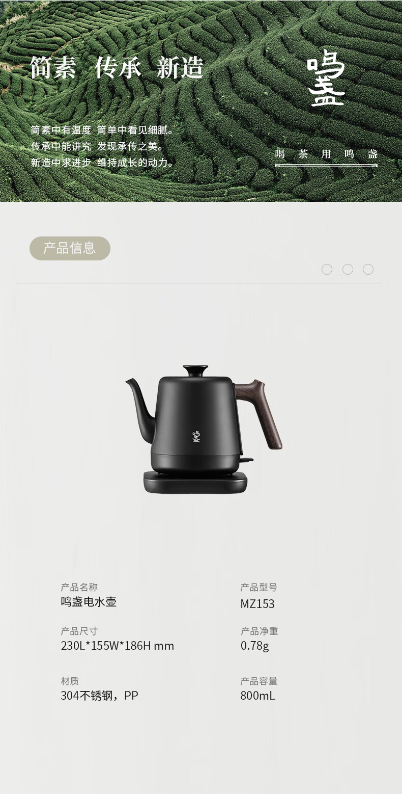 鸣盏 电热水壶烧水壶 家用烧水壶热水壶 茶艺师专用电茶壶烧水 泡茶烧水壶MZ153 黑色 0.8L