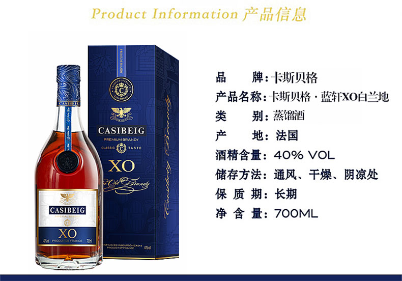 法国进口洋酒卡斯贝格蓝轩XO白兰地700ml