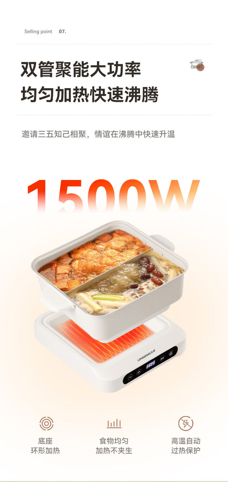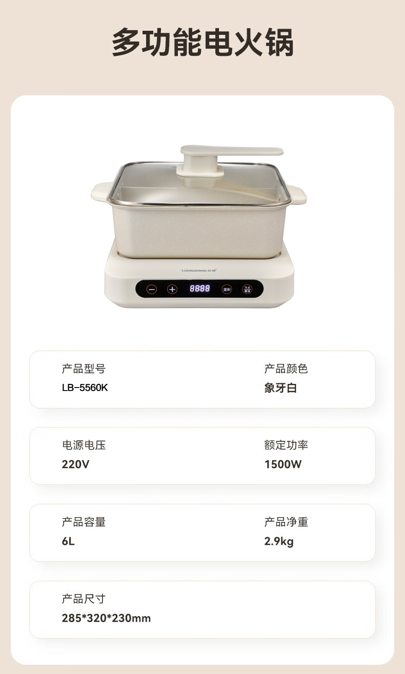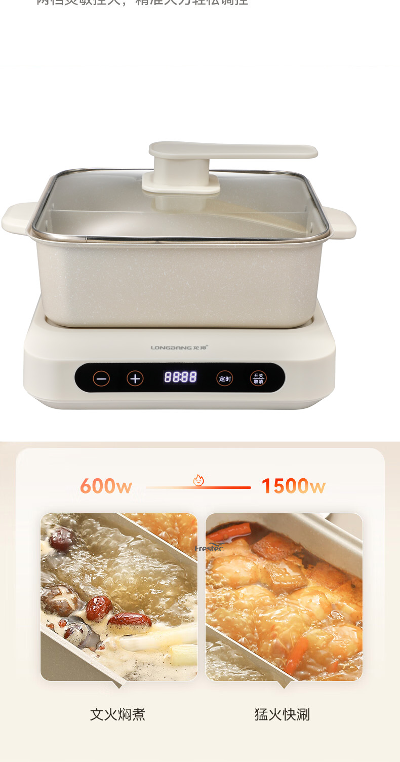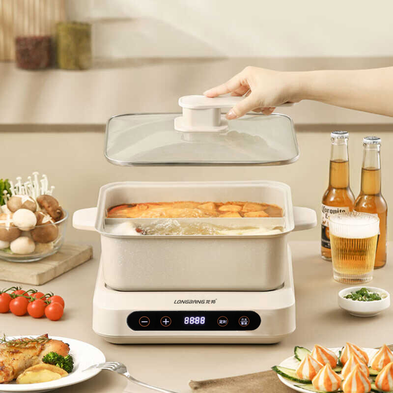 龙邦电火锅鸳鸯锅双区秒涮家用多功能煎炒分控速沸电热锅不粘分体式电煮锅 【高性价比】分区控温 LB-5560K 6L大容量