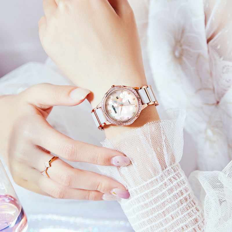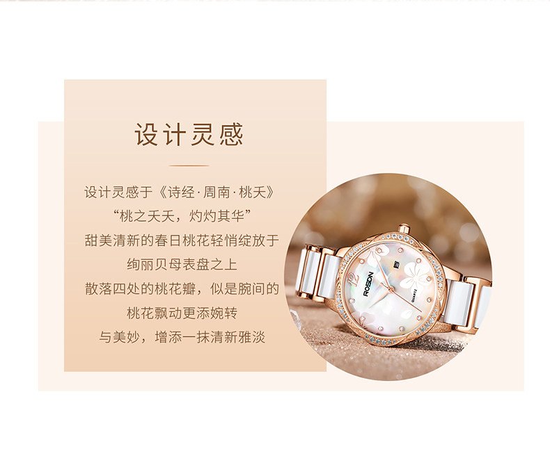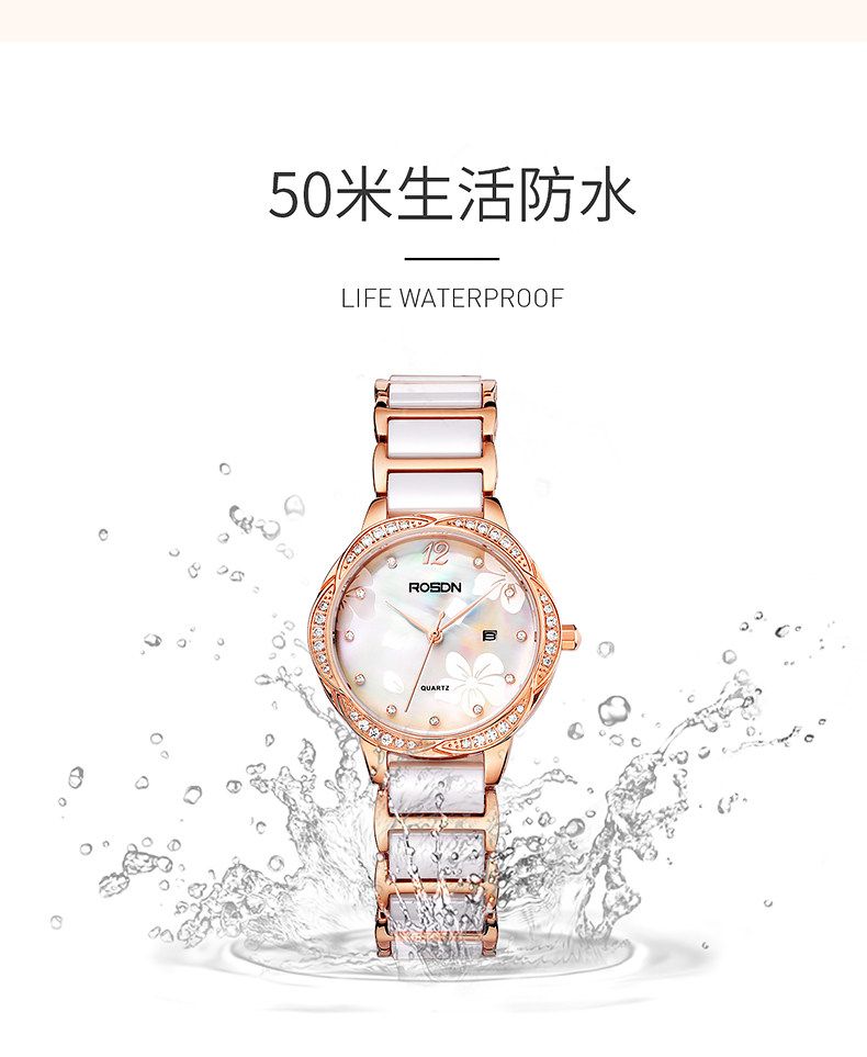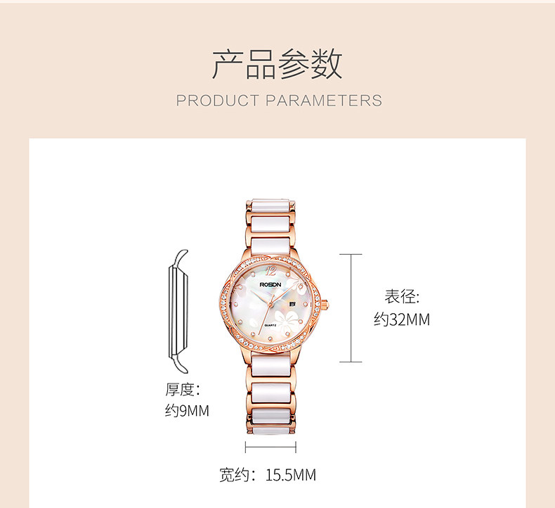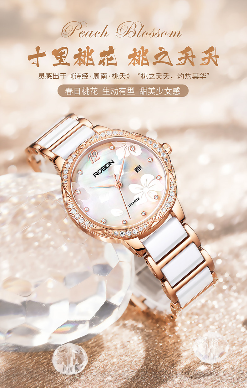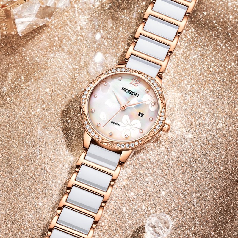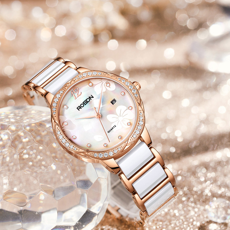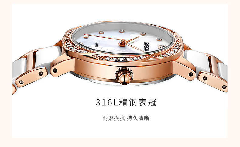 劳士顿(ROSDN)花语系列手表女日历防水陶瓷带女士手表十大品牌生日礼物盒款送女友L3170礼盒