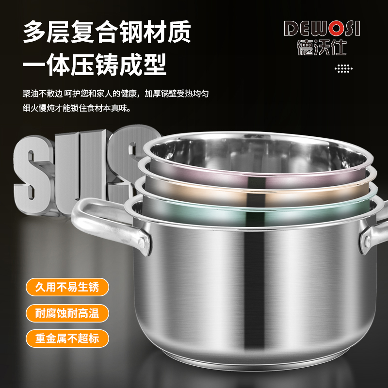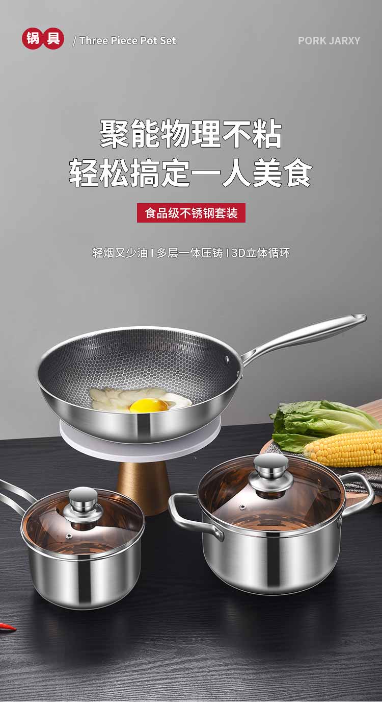德沃仕 食品级不锈钢炒锅 凯诺奇三件套 蜂窝悬浮不粘炒锅 汤锅 炖锅 炒锅 三件套 型号:DWS0063