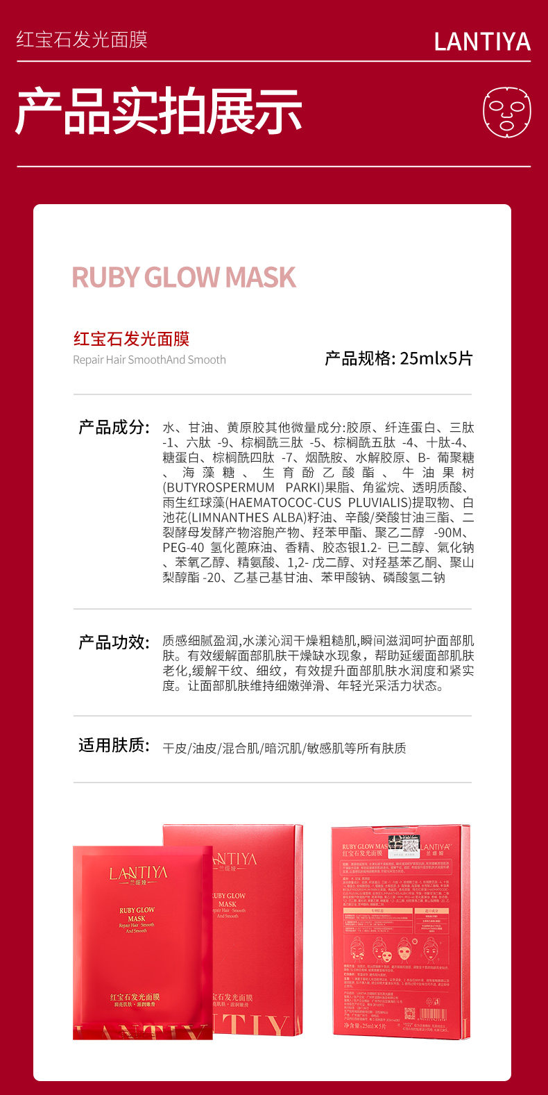 兰缇娅红宝石发光面膜补水保湿提亮肤色面膜改善脸色蜡黄25ml/*5
