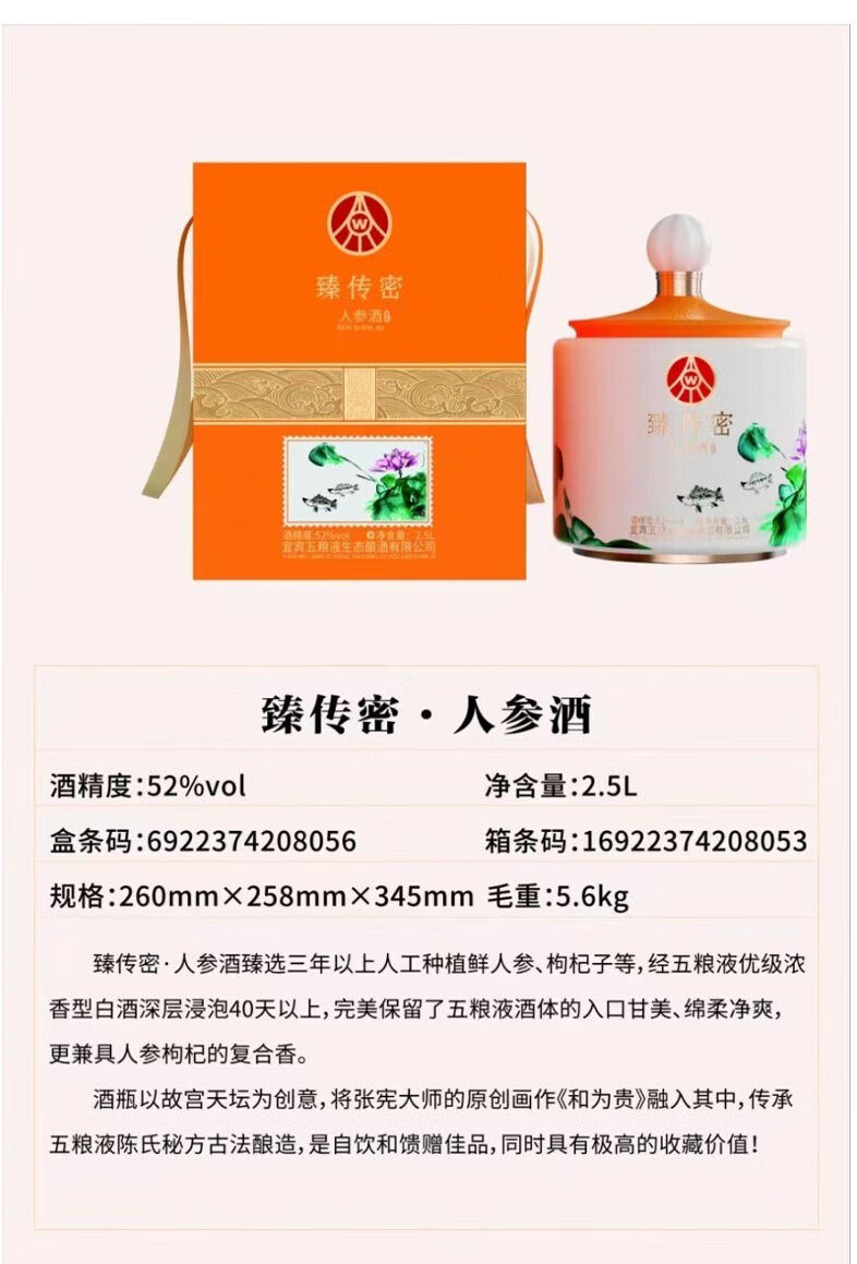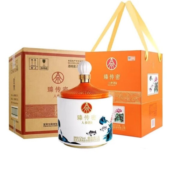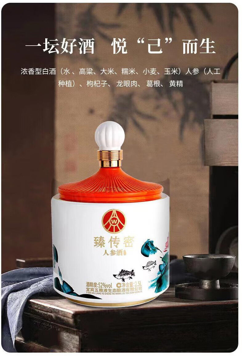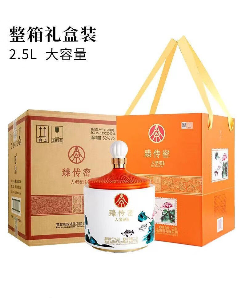 五粮液生态酿酒 臻传密人参酒 52度浓香型白酒礼盒 2.5L大坛装 5斤坛装