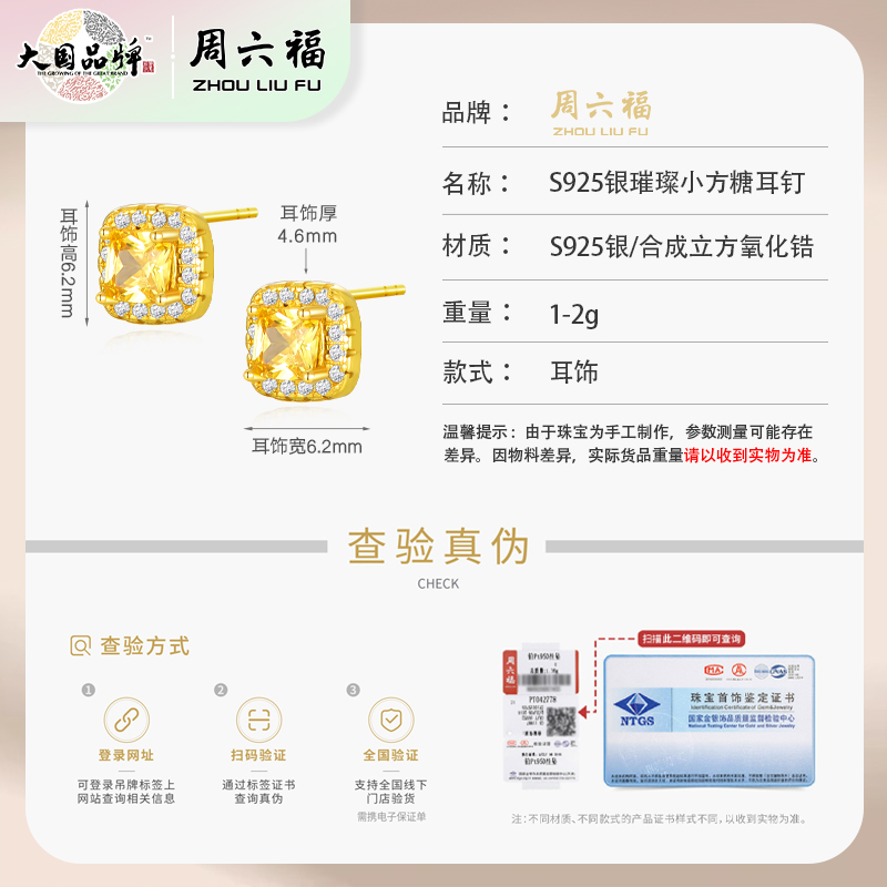 【每证一品】周六福S925银璀璨小方糖耳钉ZLFJ091835