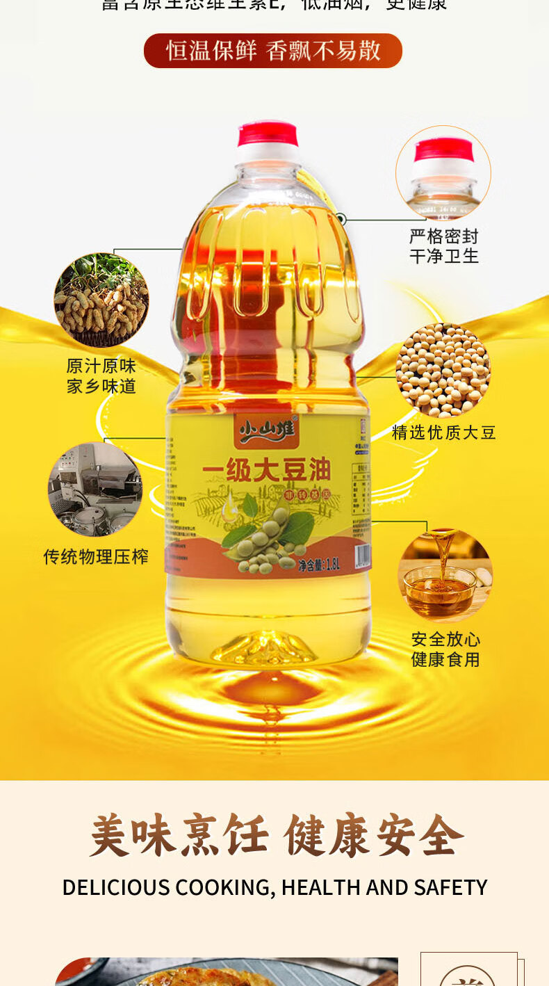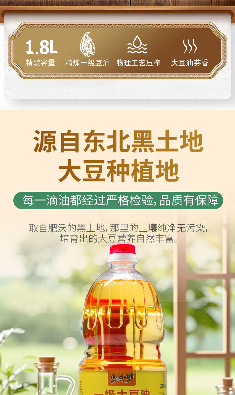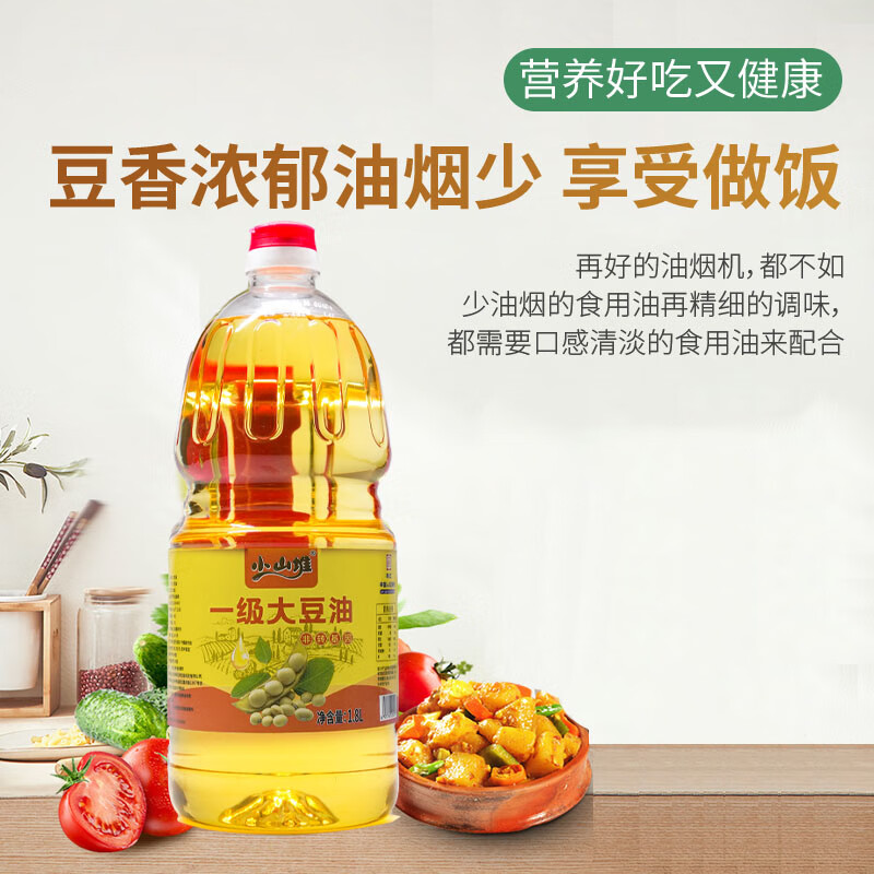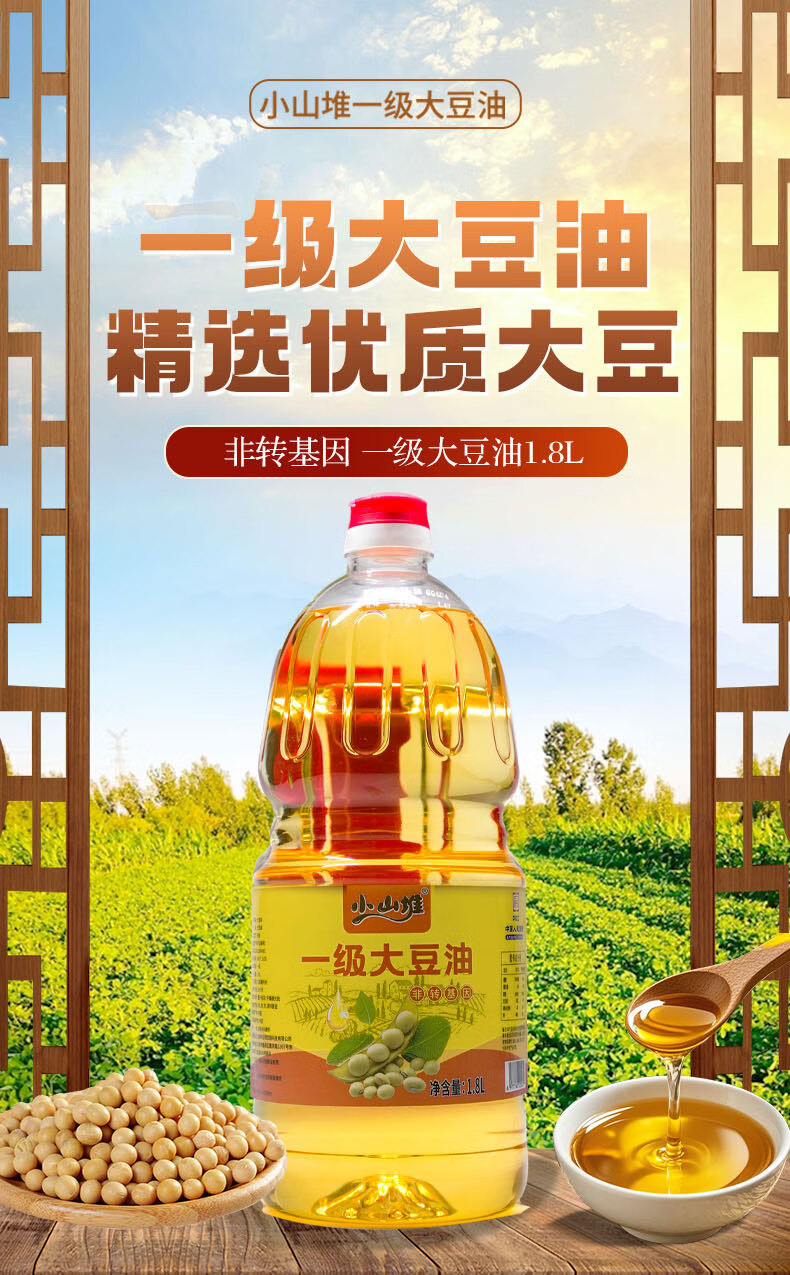 小山堆压榨一级原料非转基因一级大豆油1.8L/桶 非转基因物理压榨精选原料丰富营养一级大豆油食用油1.8L/桶