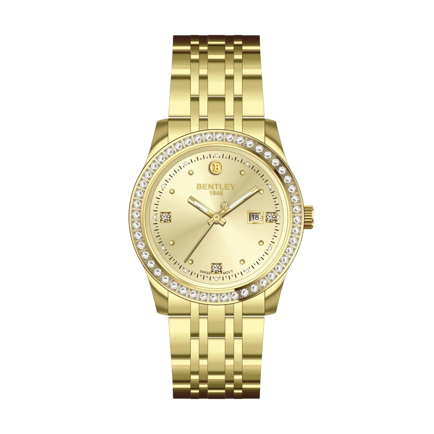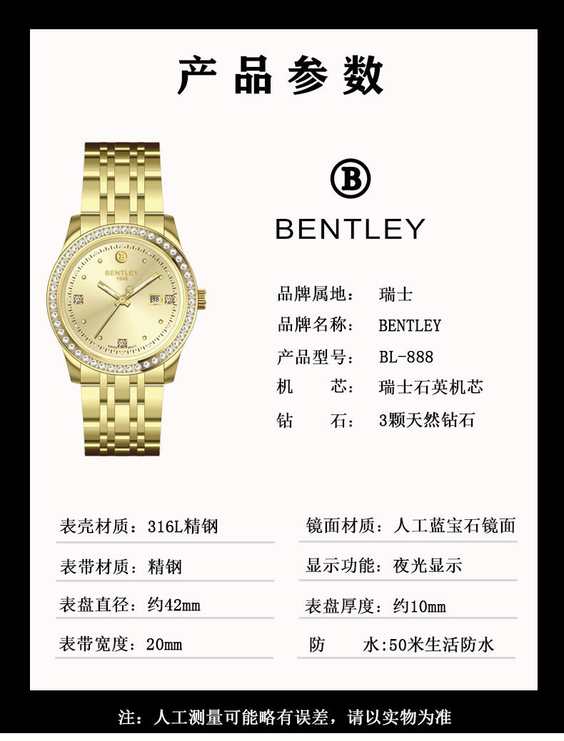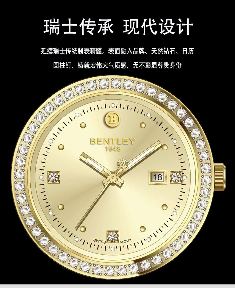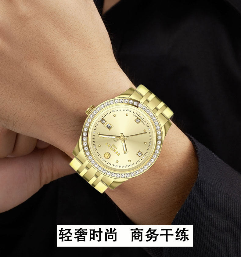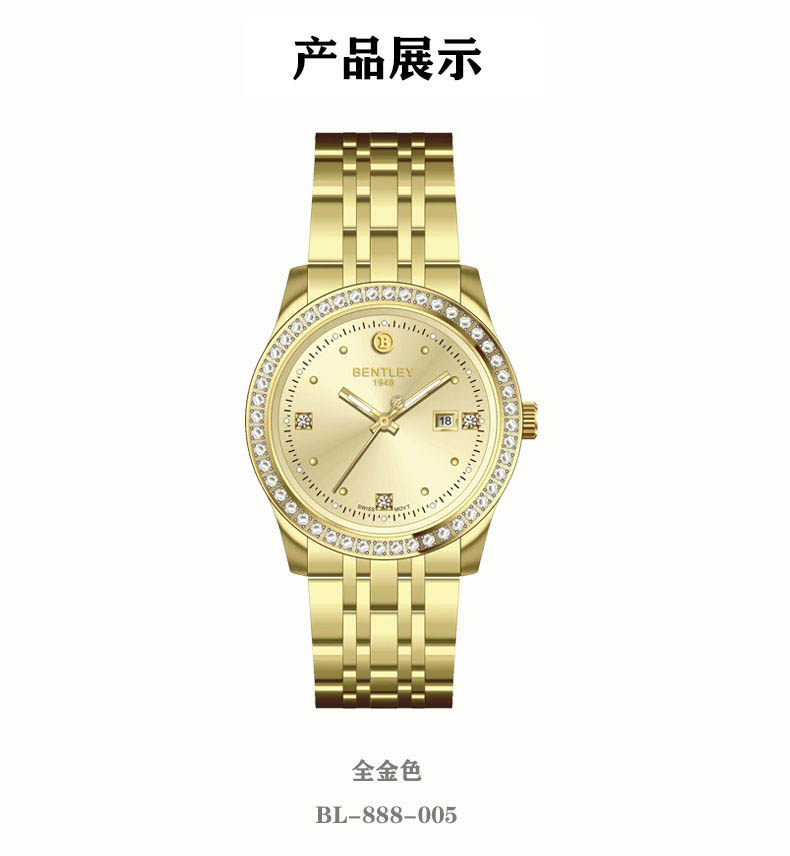 BENTLEY(宾利)大金表瑞士进口机芯天然真钻男士钢带轻奢腕表 BL-888-005全金色
