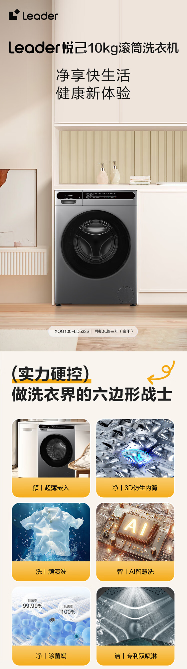 海尔/Haier Leader系列 全自动变频滚筒洗衣机 智能投放家用10公斤大容量洗衣机 整机保修10年 型号:XQG-LD533S 送货上楼