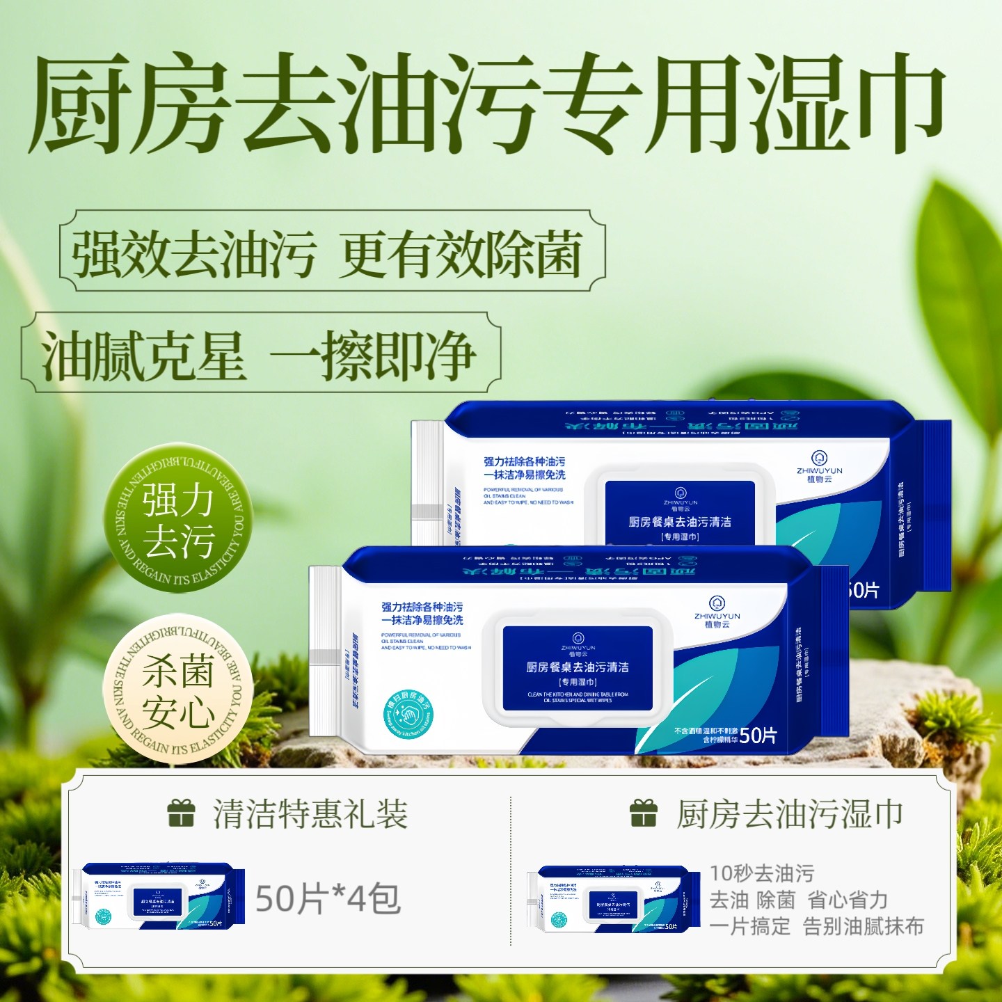 植物云厨房餐桌去油污清洁湿巾50抽*4包