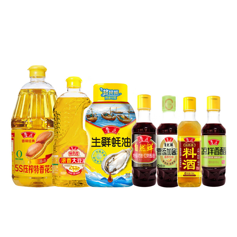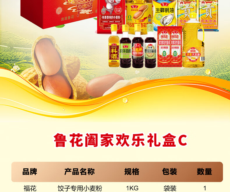 鲁花阖家欢乐礼盒C 普区包邮 春节送礼【福花饺子专用小麦粉1KG*1+鲁花香味经典花生油1.8L*1+鲁花生鲜蚝油(挤压瓶)528ml*1+福花万年贡米臻品大米500g*2+鲁花自然香料酒418ml*1+鲁花凉拌香醋418ml*1+鲁花自然鲜红烧酱油418ml*1+鲁花零添加酱油(酱香生抽)418ml*1+鲁花厨中香金丝椭圆面300g*2+鲁花厨中香浓香大豆油900ML*1】【春节假期 1月20日