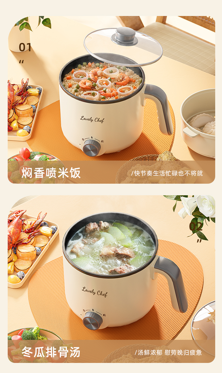 Lovely Chef 萌厨多功能电煮锅 宿舍迷你煮面长柄蒸笼学生家用电火锅 米白色2L型号 BH-18060L