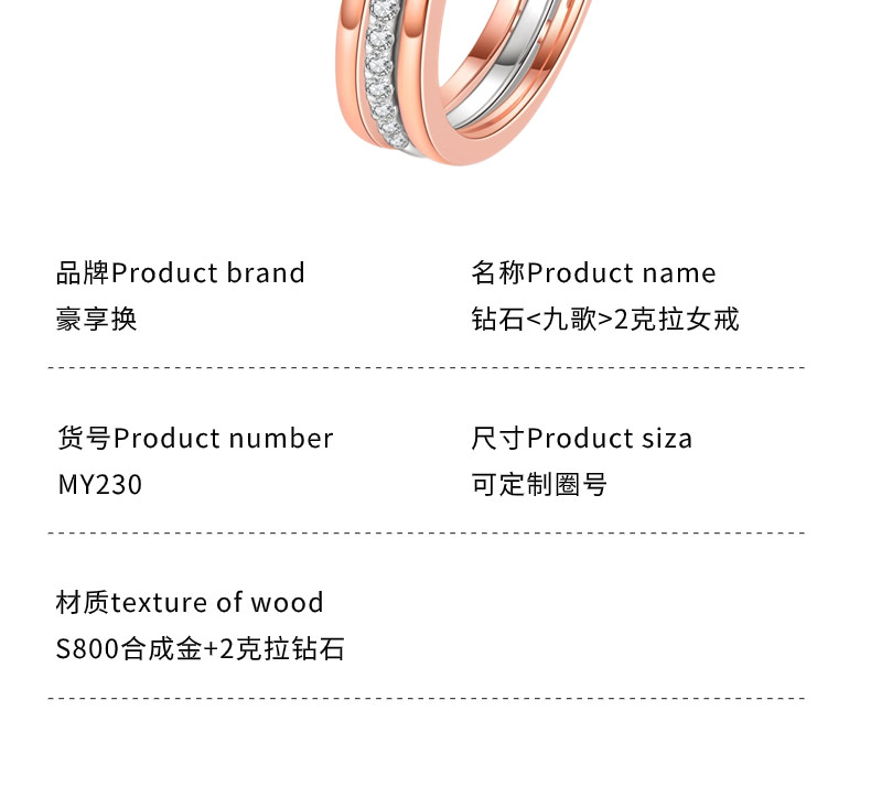 豪享换JLF CVD【培育钻石】D/FL/3EX九歌 2克拉戒指 女戒MY230(圈口10号-20号,可定制尺寸圈号)