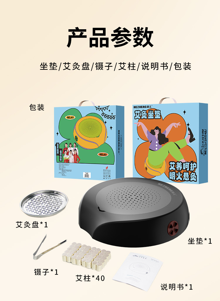 配置:艾灸坐垫+40个艾柱+镊子+铁盘