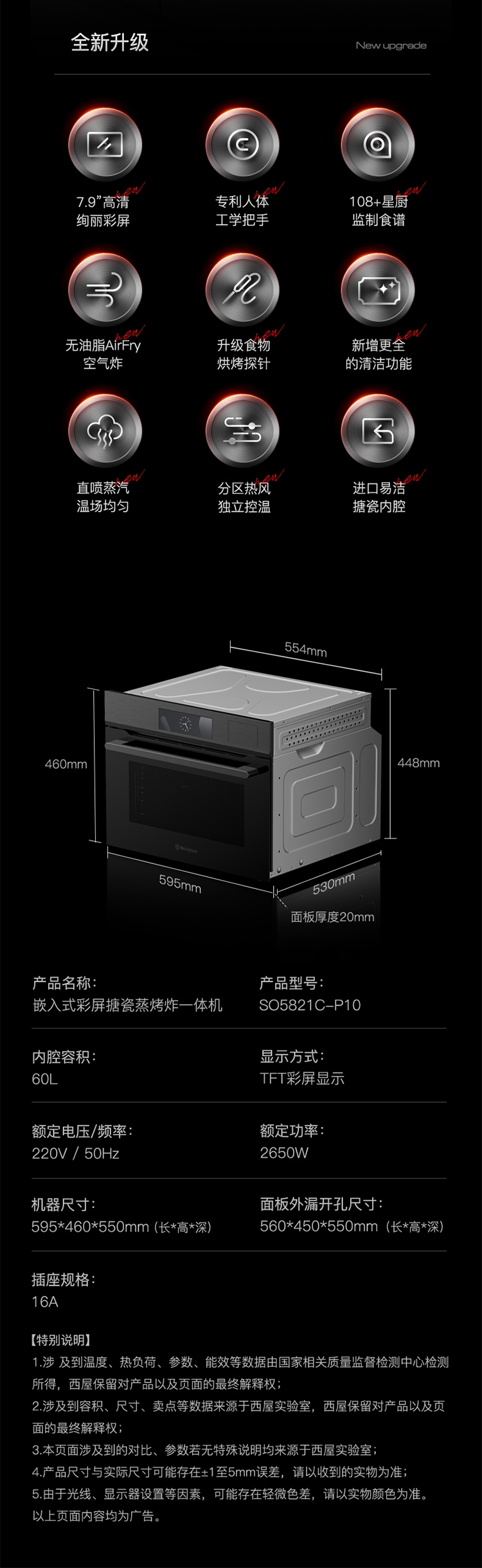 西屋Westinghouse蒸烤箱一体机嵌入式 普区包邮 蒸箱烤箱蒸烤炸一体机家用蒸烤炸一体SO5821C-P10包安装