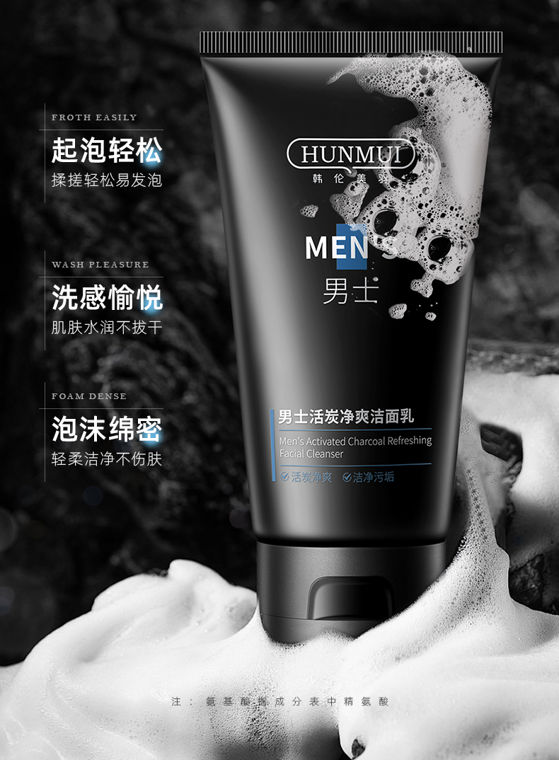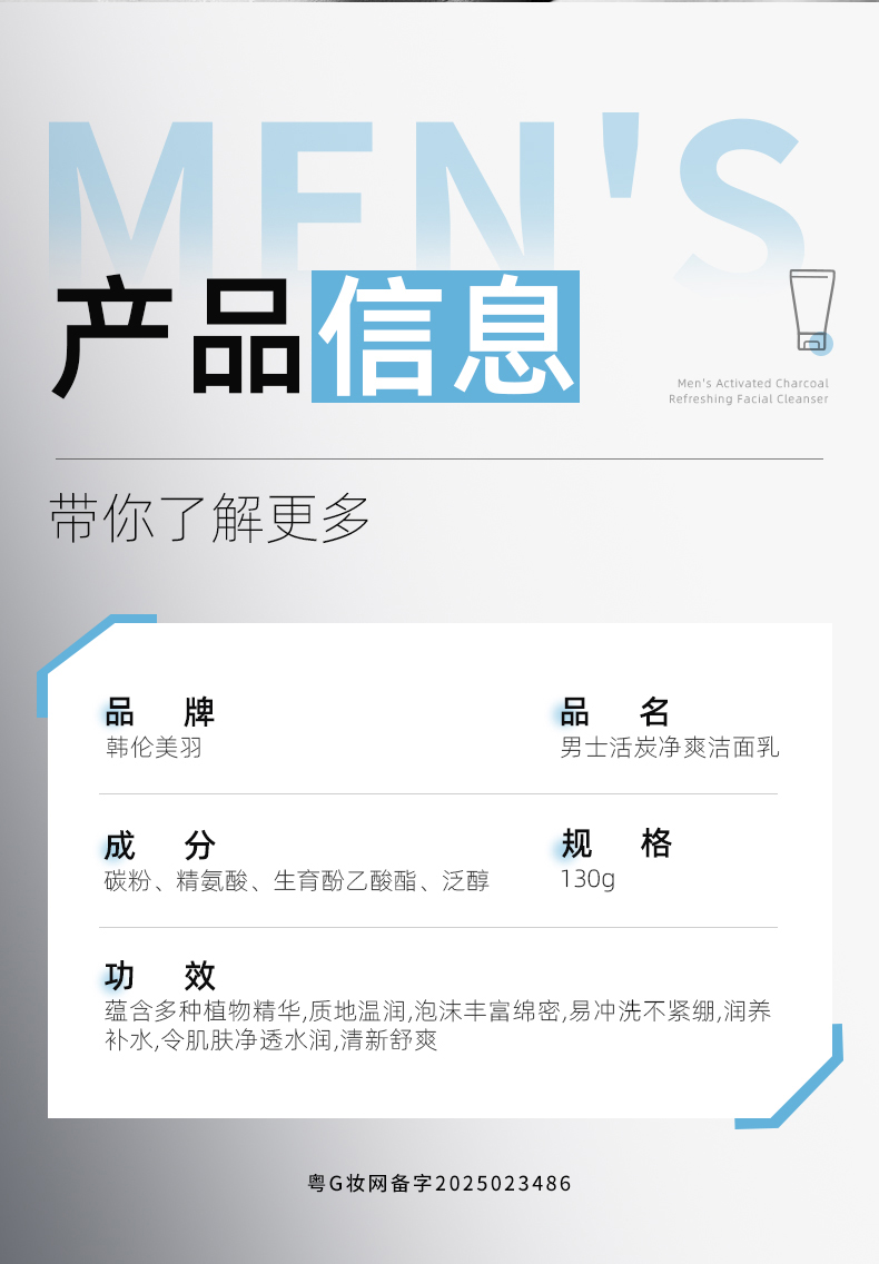 【3瓶装】韩伦美羽男士活炭净爽洁面乳黑色130g SY10194 送男友送老公