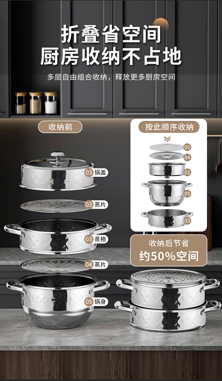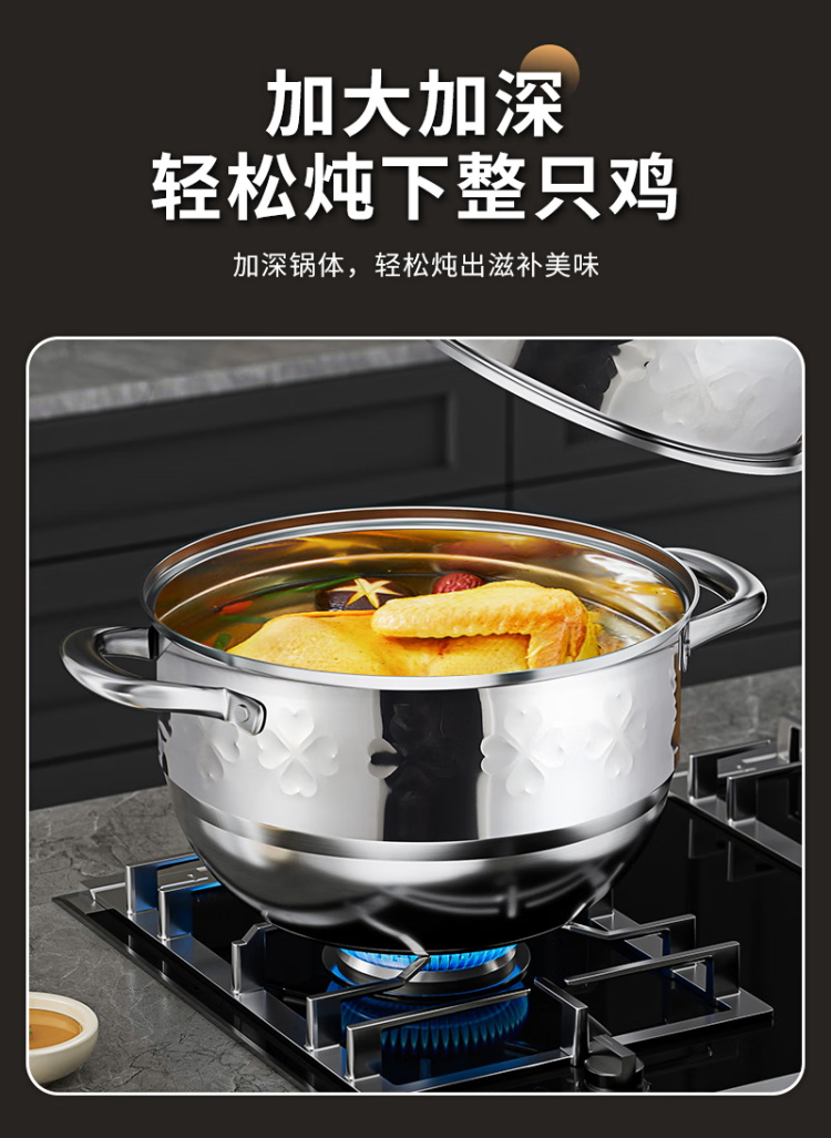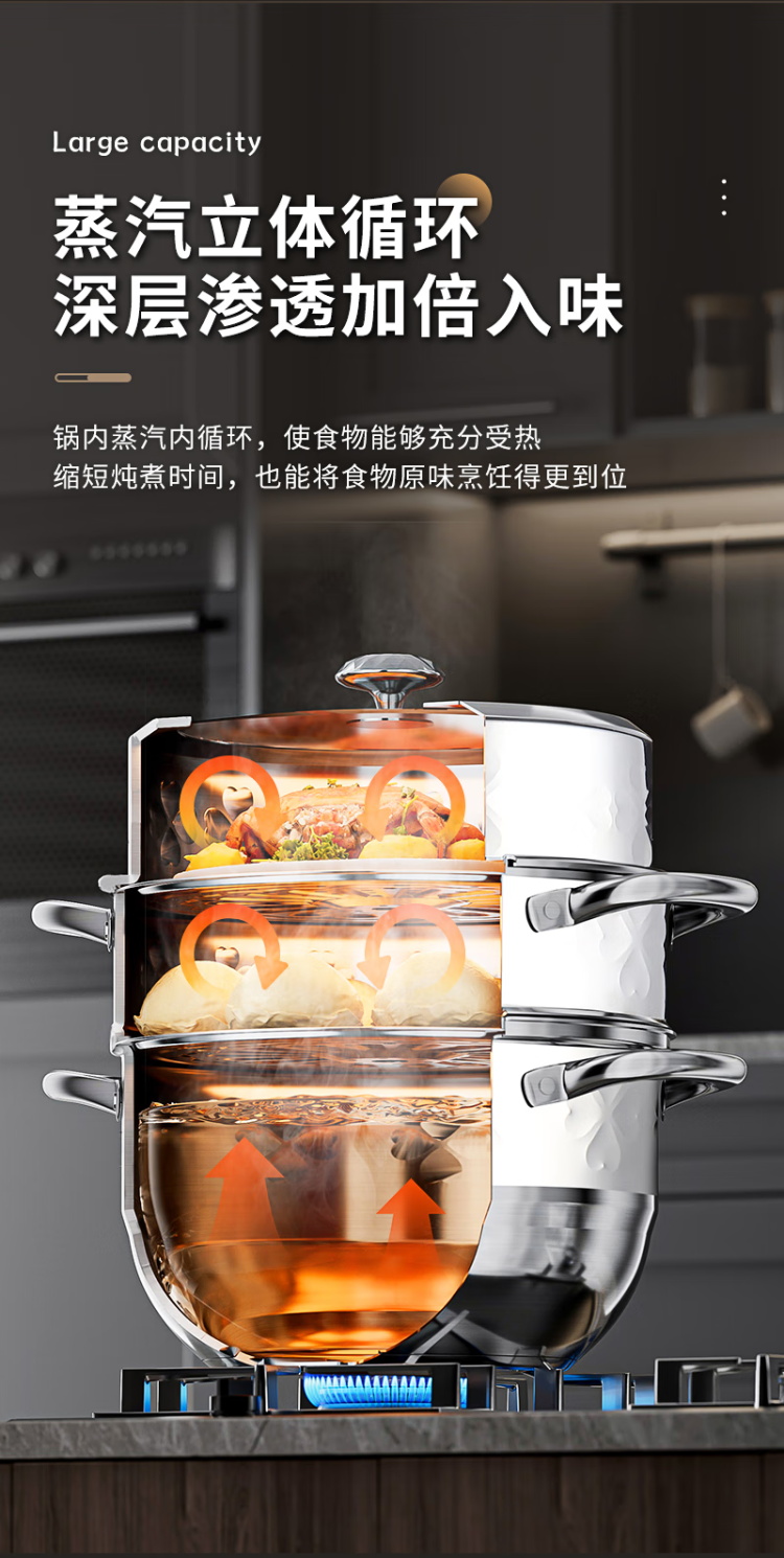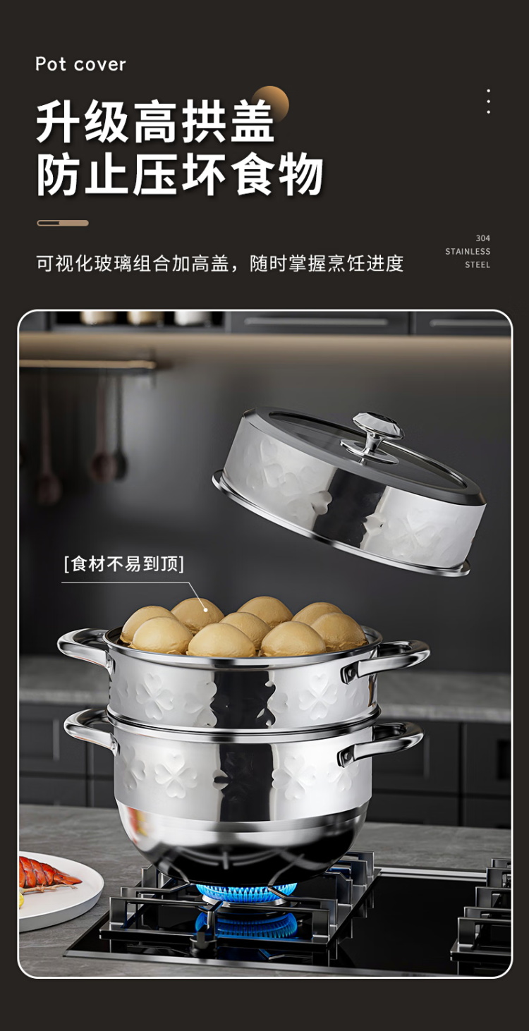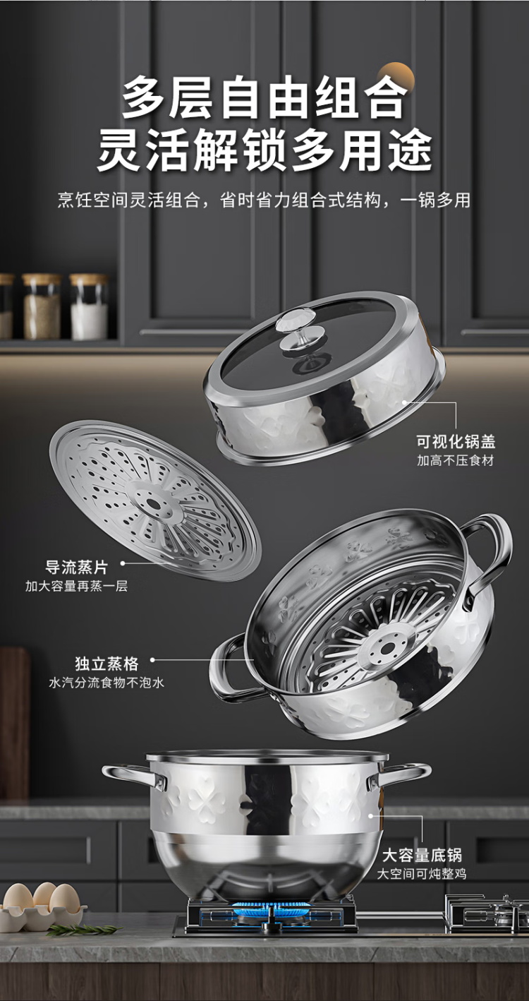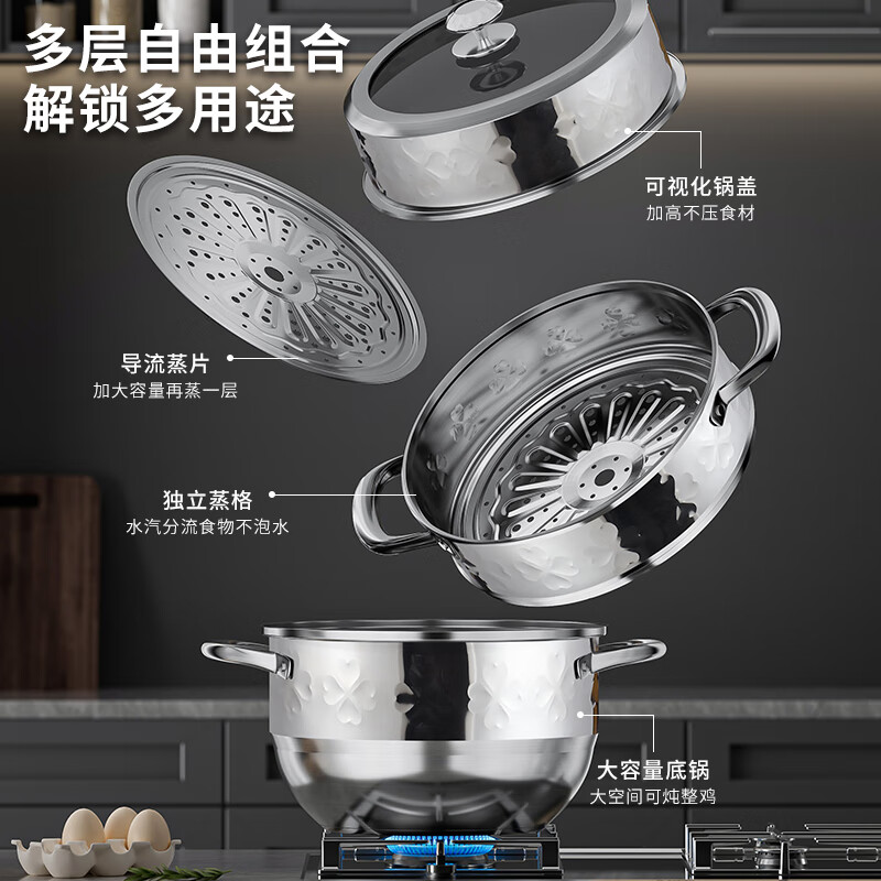 执厨心心相印不锈钢三层蒸锅28cm多功能汤锅火锅蒸煮一体