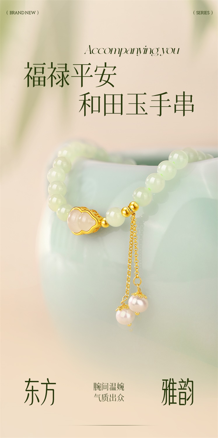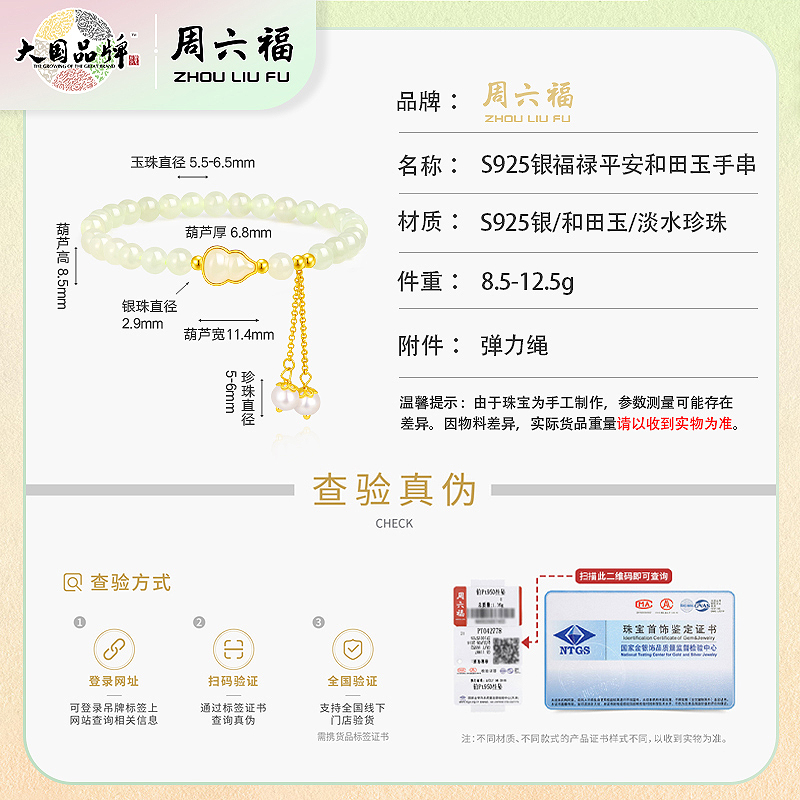 【每证一品】周六福银925和田玉手串ZLFY122272 节日礼物生日礼物 送女友送妈妈送朋友 母亲节礼物