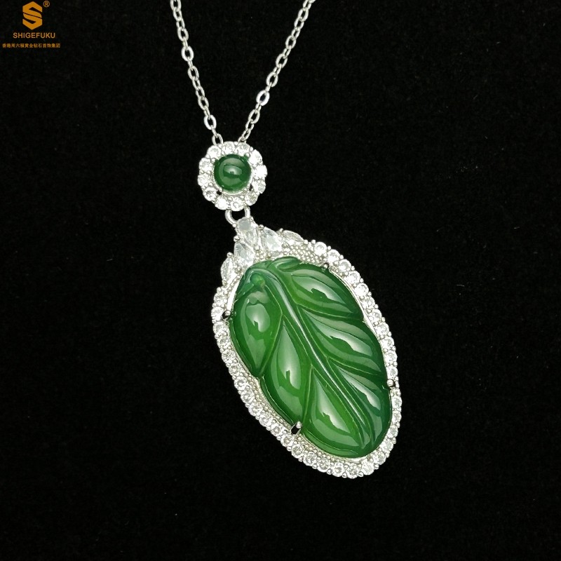 香港周六福黄金钻石首饰祖母绿玉髓一叶暴富吊坠(附赠K金项链)