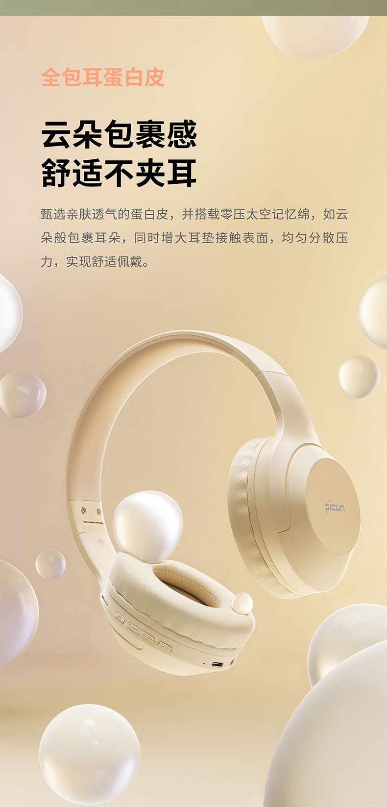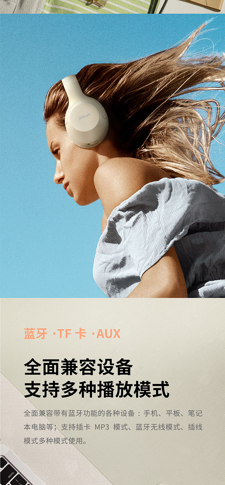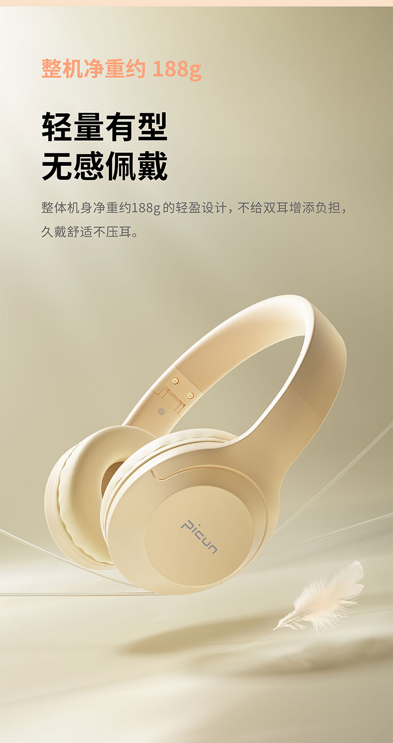 Picun品存头戴式隔音降噪蓝牙耳机 46小时超长续航+蓝牙5.3游戏低延迟 支持AUX有线/TF卡双模式 可折叠便携 高性价比耳机 B-01S 黑色/卡其白/白灰色