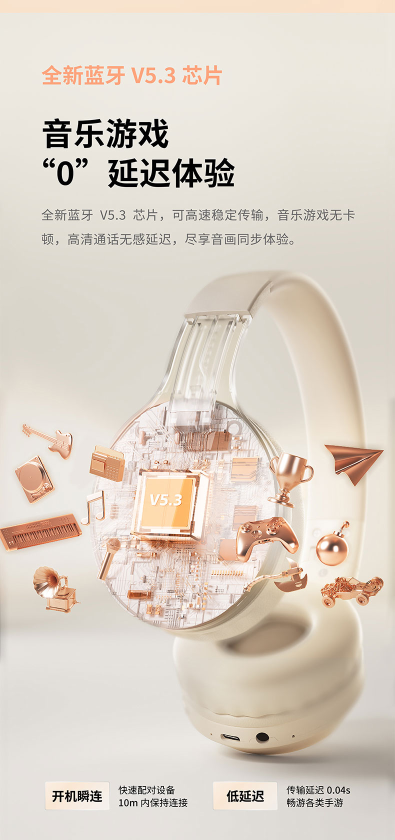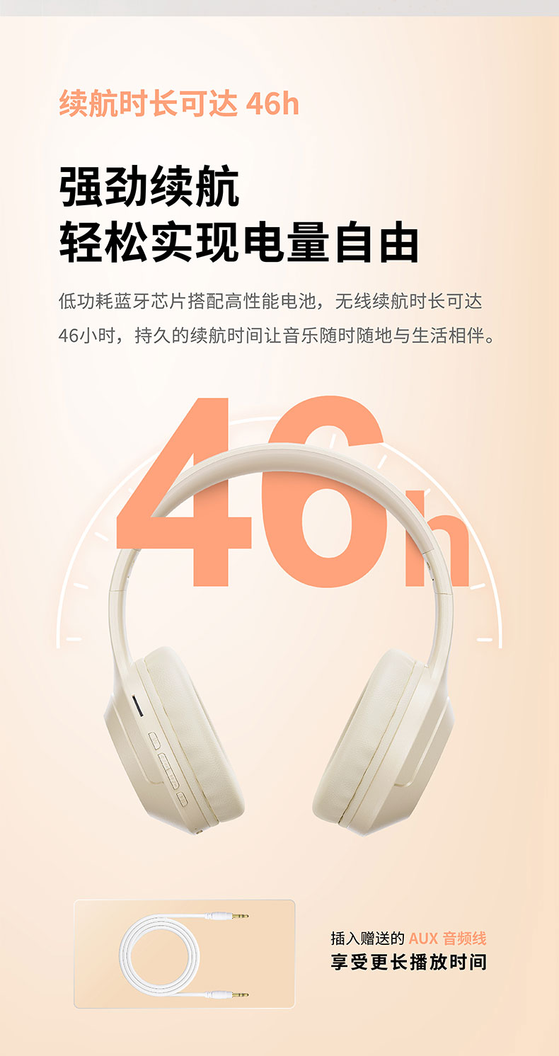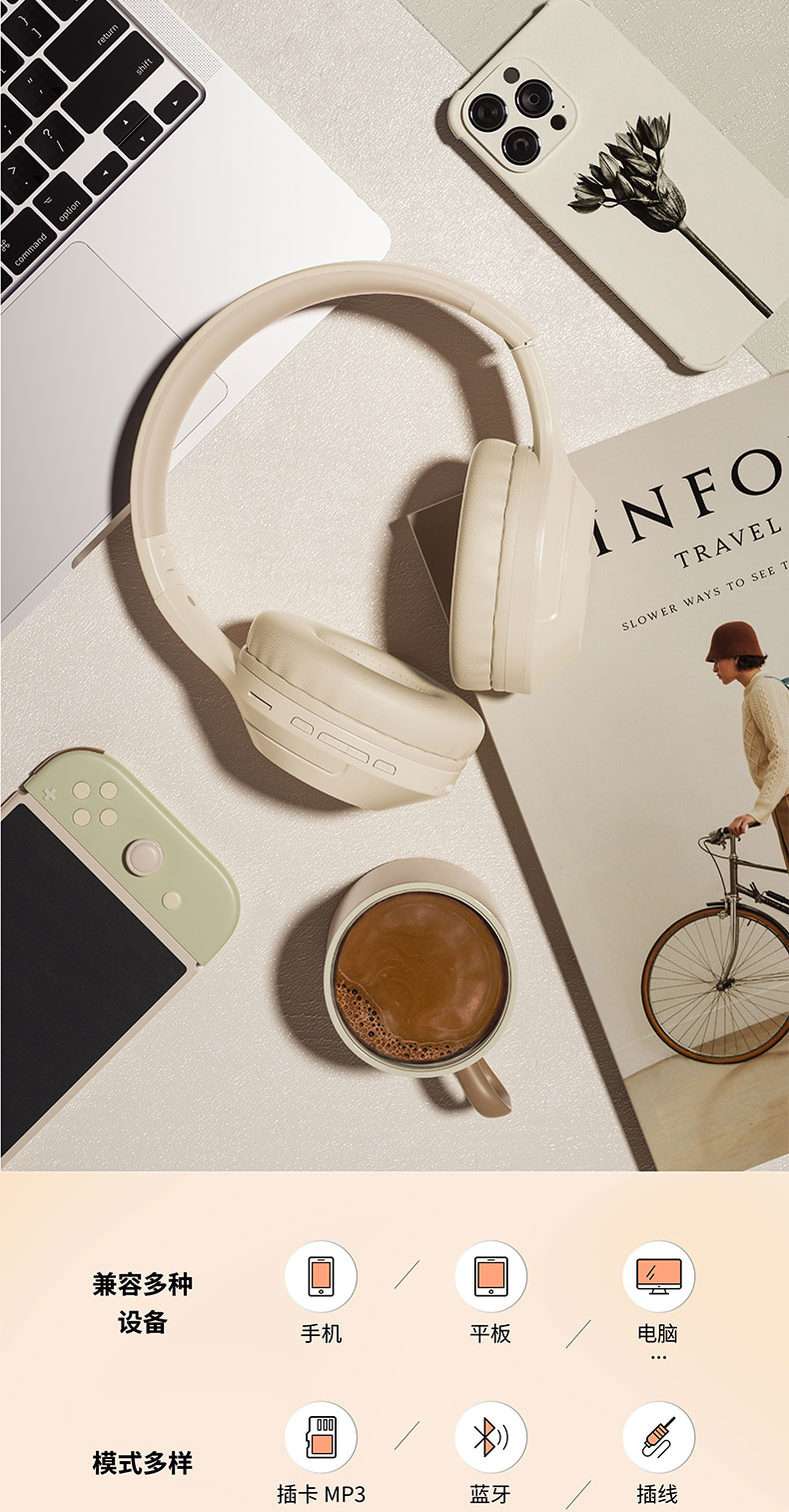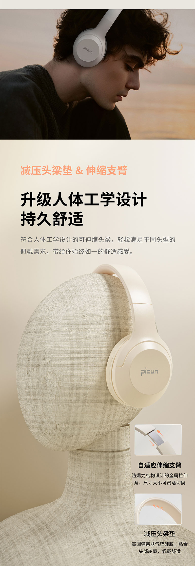 Picun品存头戴式隔音降噪蓝牙耳机 46小时超长续航+蓝牙5.3游戏低延迟 支持AUX有线/TF卡双模式 可折叠便携 高性价比耳机 B-01S 黑色/卡其白/白灰色