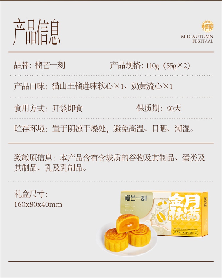 榴芒一刻 常温尝鲜组合月饼110克【猫山王榴莲软心+奶黄流心】【55g*2枚】*2盒