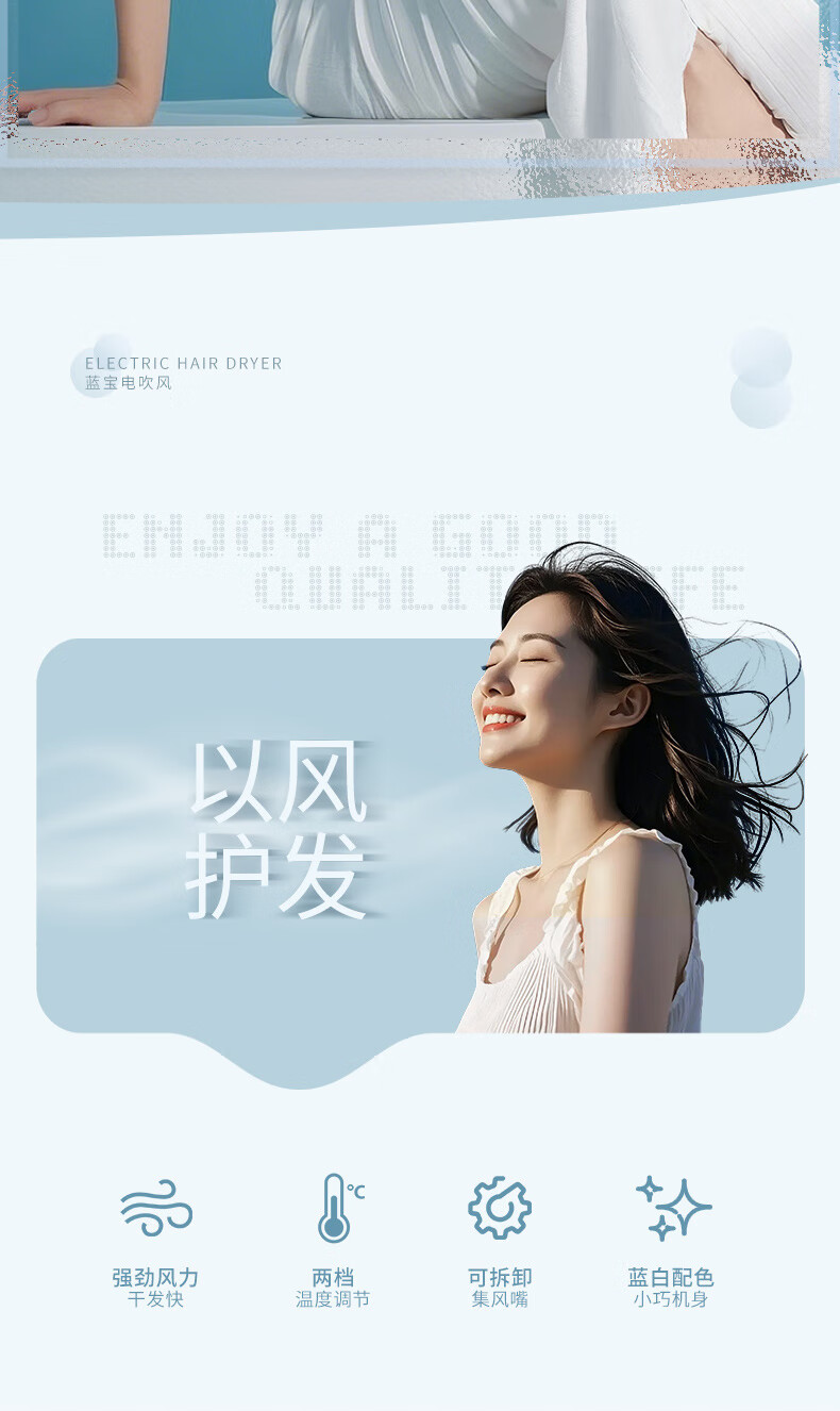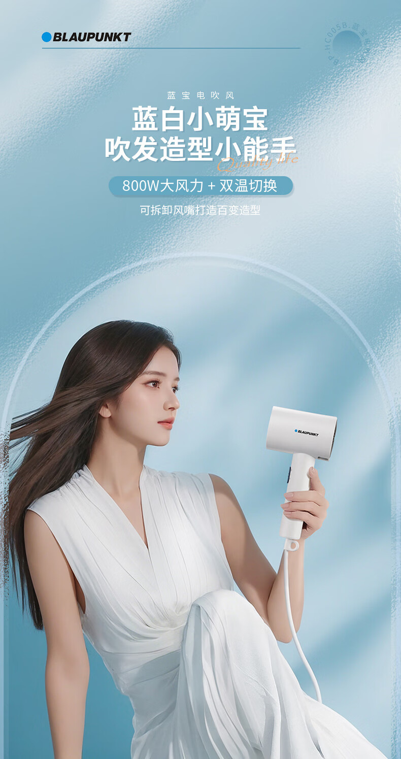 德国蓝宝电吹风家用护发大功率吹风机大风速速干电吹风筒BP-HC005B 白色