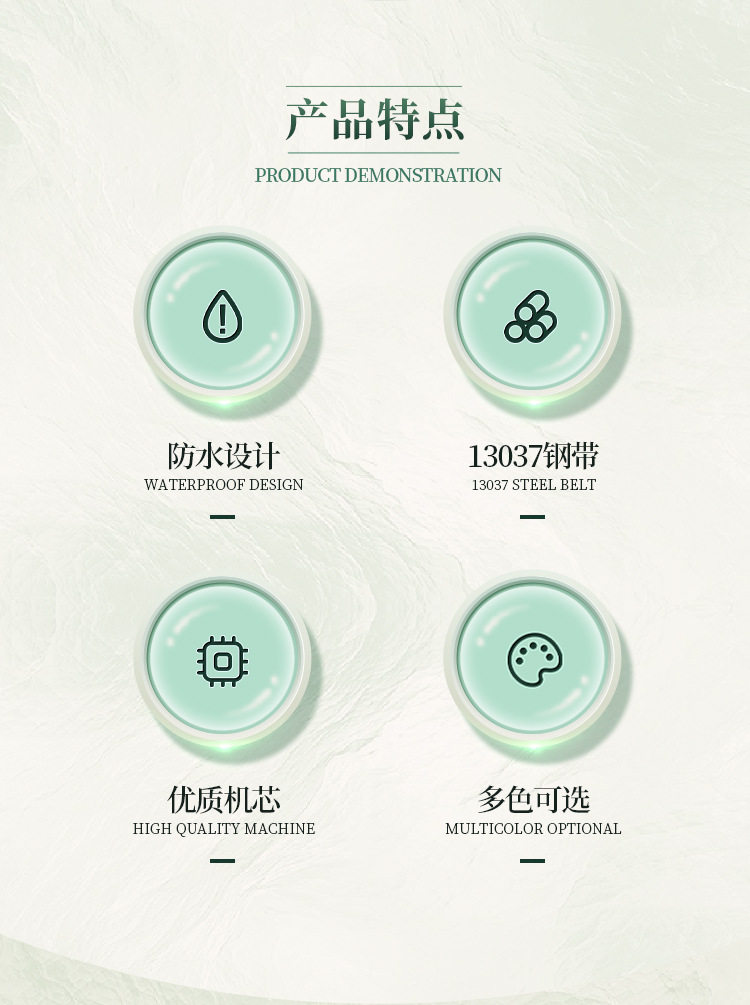 3、间金带玫金壳红盘;4、银带银壳绿盘