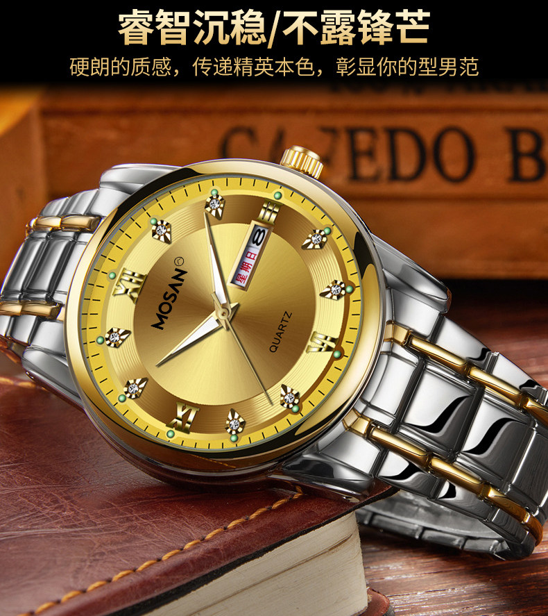 魔山石英表质感礼物手表送爸爸送老公成功男人风夜光手表 金面间金表带