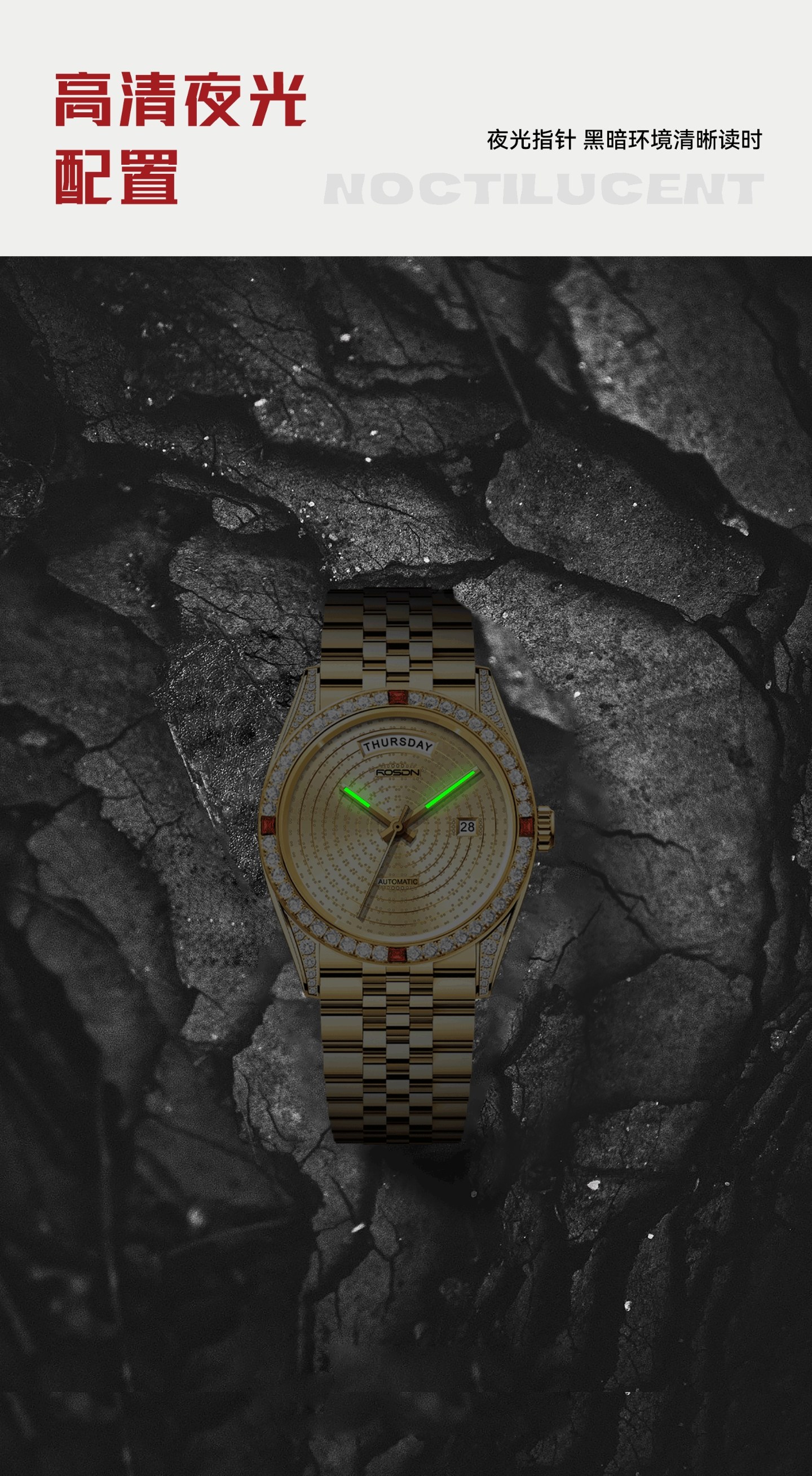 劳士顿(ROSDN)锐意光芒系列男士潮流金表全自动机械男士手表十大品牌 2762全金金面钢带