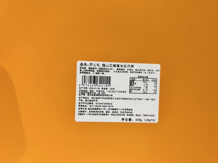 开心礼开心饼艺猫山王榴莲冰皮月饼6枚装408g/盒