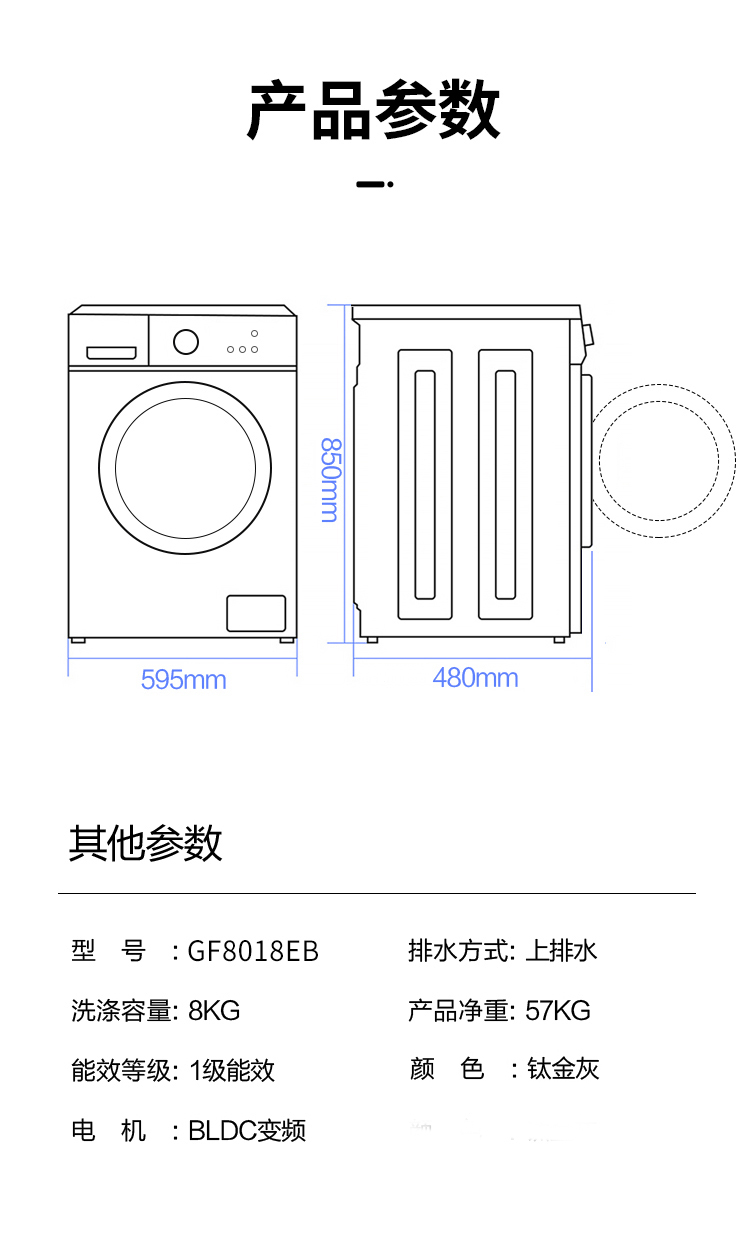 创维8KG滚筒洗衣机 变频一级能效家用抗菌除螨安全童锁GF8018EB钛金灰