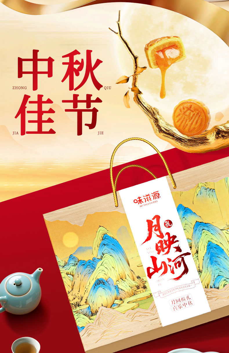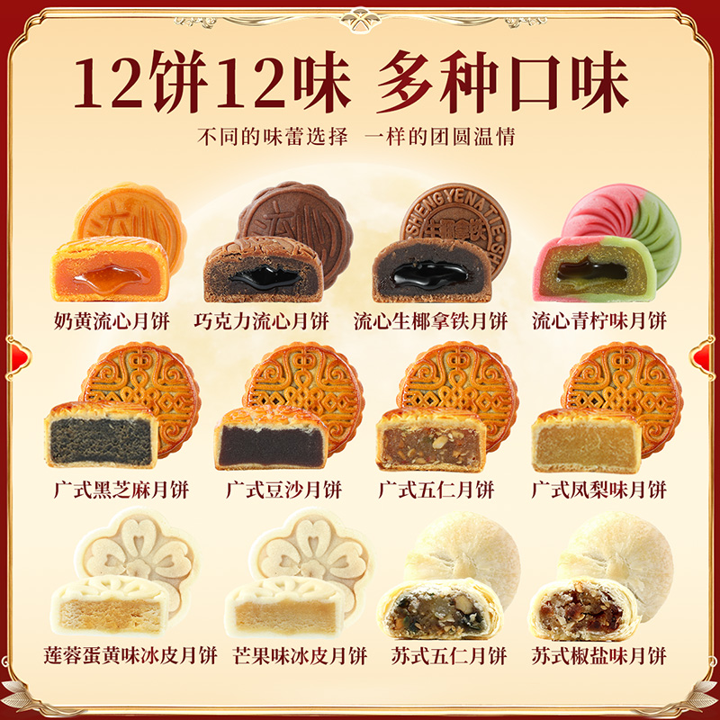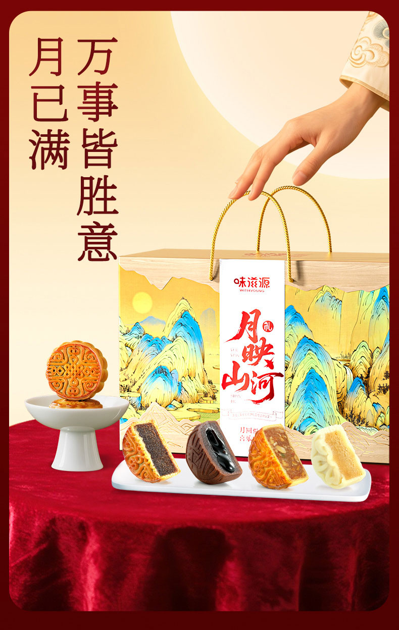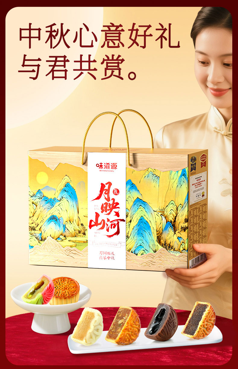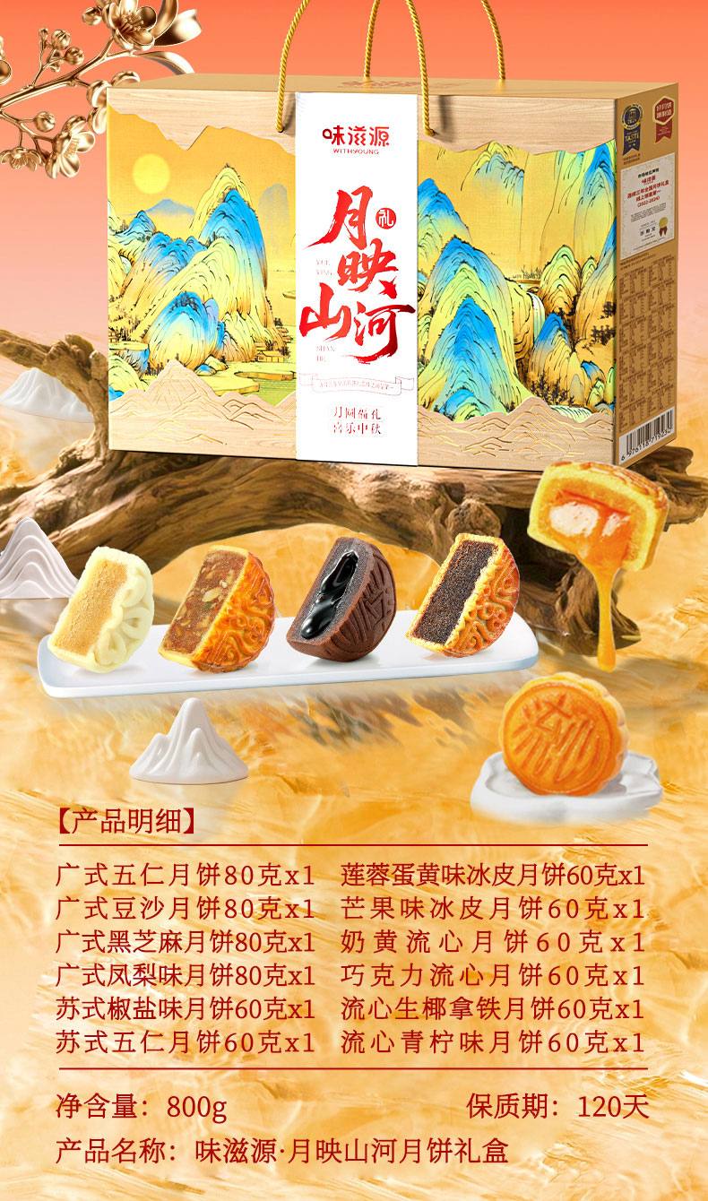 {12饼12味}味滋源月映山河800g 普区包邮月饼礼盒 企业福利送礼【广式五仁月饼+广式豆沙月饼+广式黑芝麻月饼+广式凤梨味月饼+苏式椒盐月饼+苏式五仁月饼+莲蓉蛋黄味冰皮月饼+芒果味冰皮月饼+奶黄流心月饼+巧克力流心月饼+流心生椰拿铁月饼+流心青柠味月饼】