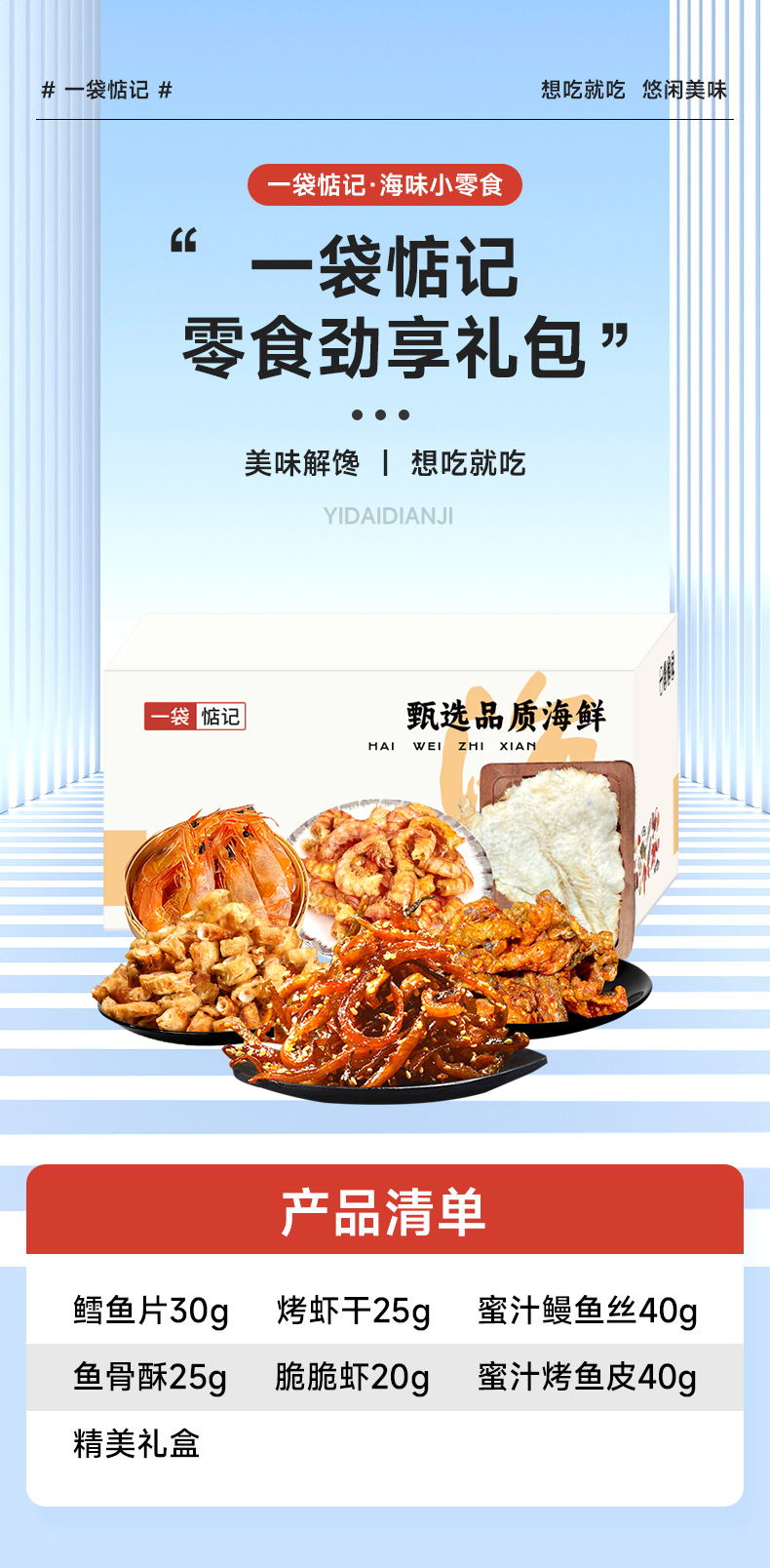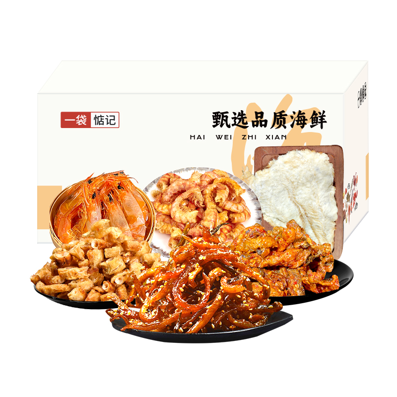 一袋惦记海鲜零食礼盒-89C型【鳕鱼片+香辣鳗鱼丝+烤虾干+蜜汁烤鱼皮+鱼骨酥+脆脆虾】