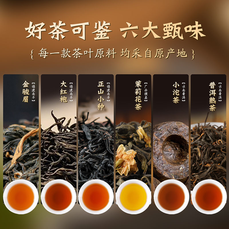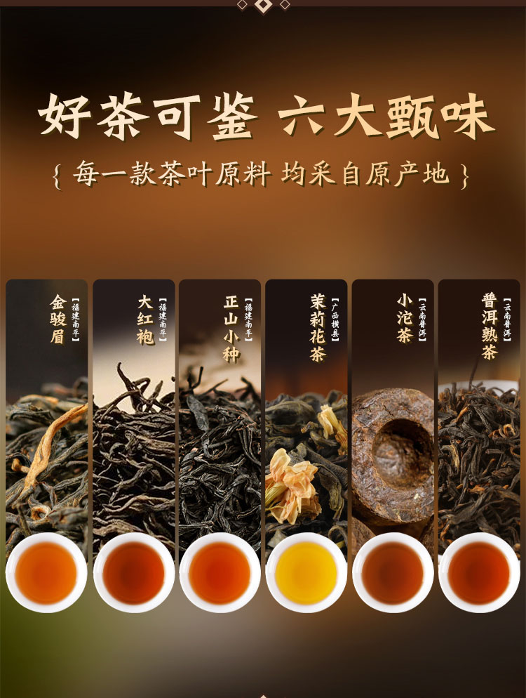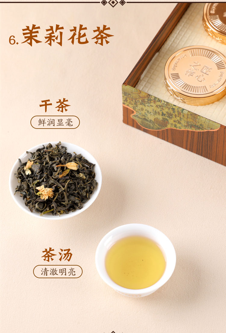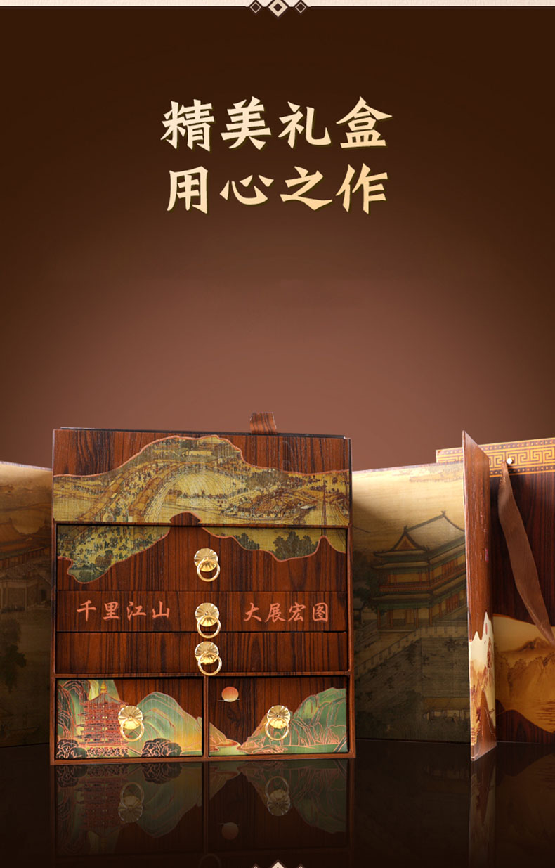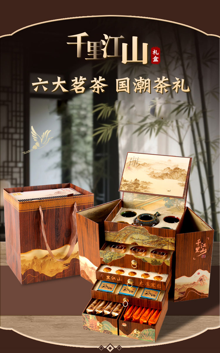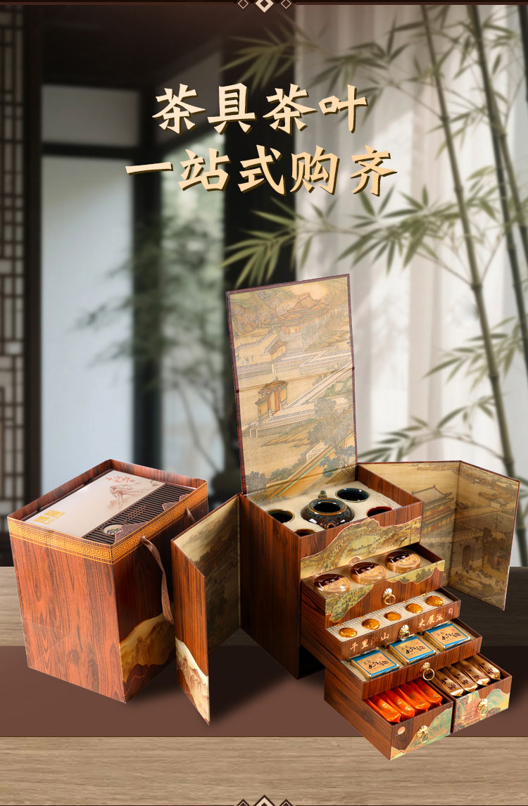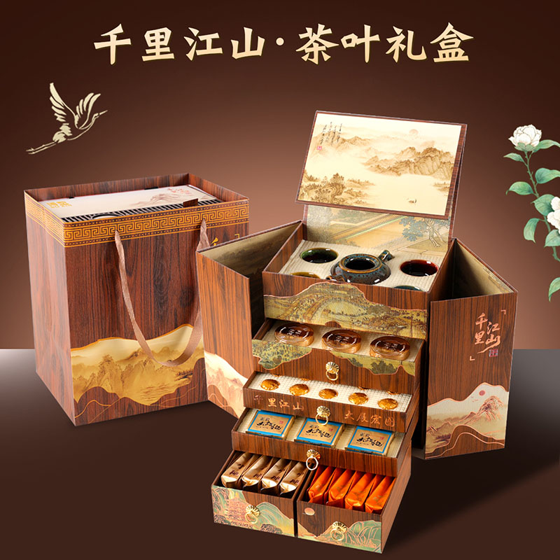 博馨 千里江山茶叶礼盒 大红袍 金骏眉 正山小种 茉莉花 小沱茶 普洱熟茶 精美礼盒装 内附精美茶具 单盒附赠手提袋 净含量:370g
