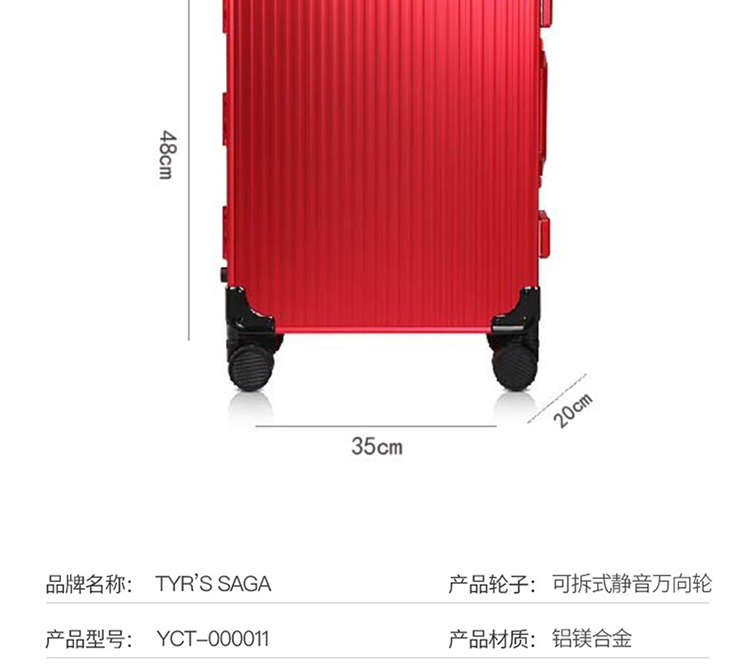 TYR'SSAGA 泰尔传奇 潮流时尚个性拉杆箱万向轮20寸拉杆箱全镁铝合金海关锁密码行李箱静音万向轮行李箱商旅两用 红色 YCT-000011