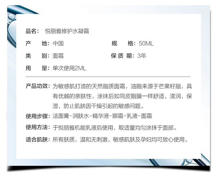 悦丽雅UELIA机能修护面霜水凝霜保湿凝露改善敏感肌50ml 补水保湿