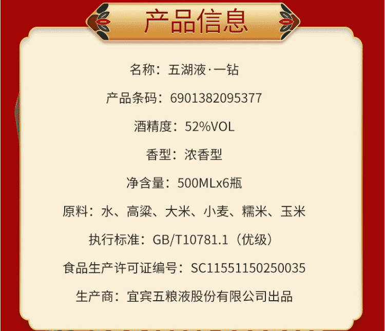 五粮液股份公司出品 五湖液一钻500ml*6 浓香型白酒52度 整箱