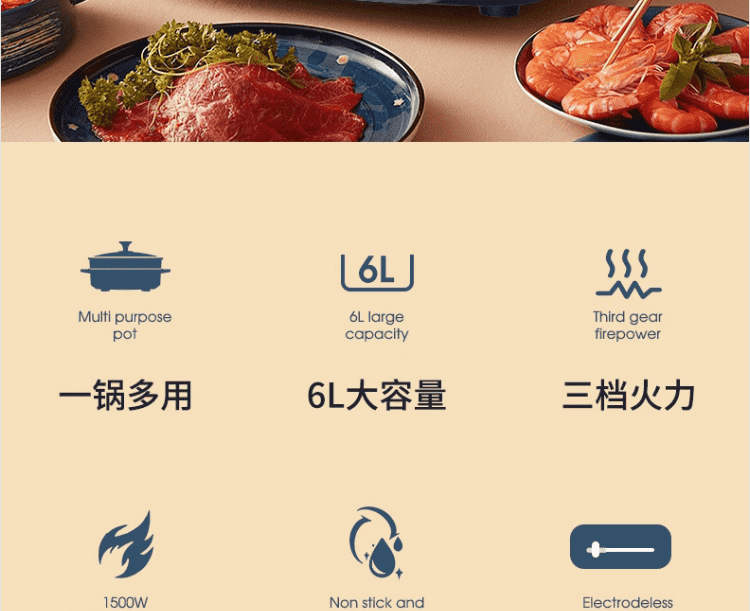 九阳电火锅6L容量 煎炒炖煮锅蒸锅 蒸汽海鲜串串香HG60-G650