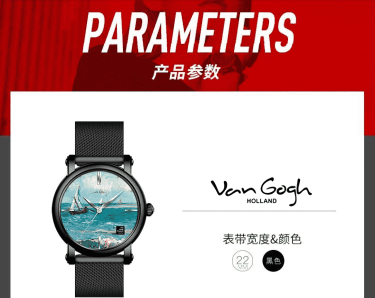 梵高(Vangogh) 典藏系列 男士手表小众轻奢时尚防水腕表简约艺术学生情侣 海景Gent04-1