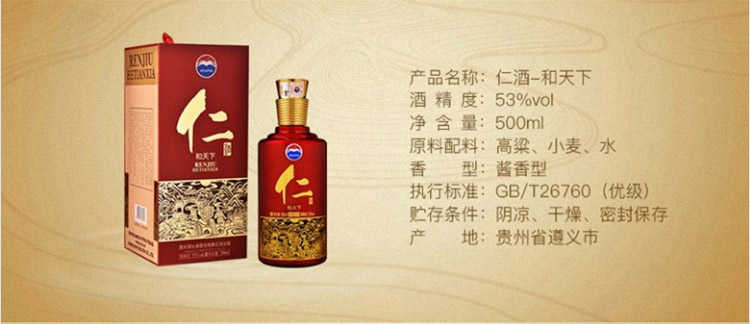 贵州茅台酒股份出品 仁酒 和天下 53度酱香型白酒 500ml * 6瓶 整箱装 新疆、西藏偏远地区不包邮