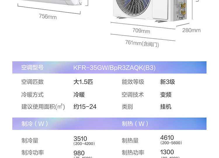 奥克斯/AUX 空调 1.5P 新能效 变频冷暖壁挂式空调挂机 1.5匹KFR-35GW/BpR3ZAQK(B3)